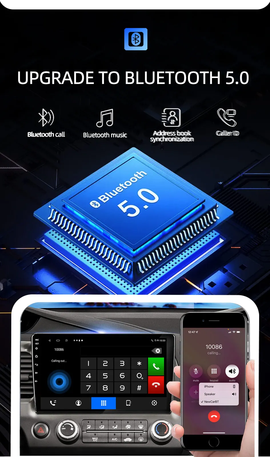 Built-in bluetooth 5.0, support bluetooth phone, bluetooth music, address book.