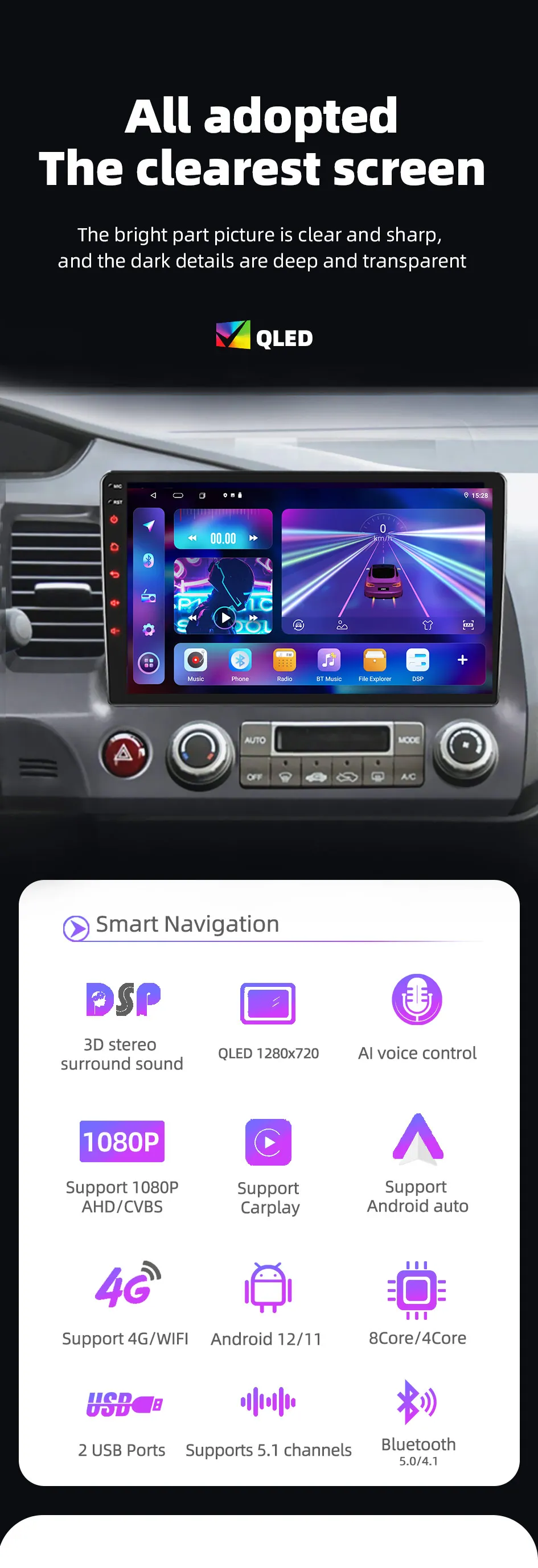 Android 11/12+QLED 1280×720+4 cores/8 cores+1GB flash memory (2GB/4GB/6GB/8GB optional) + 32GB memory (32GB/64GB/128GB optional) + WIFI (4G network optional) + steering wheel control + RDS/DSP (optional)