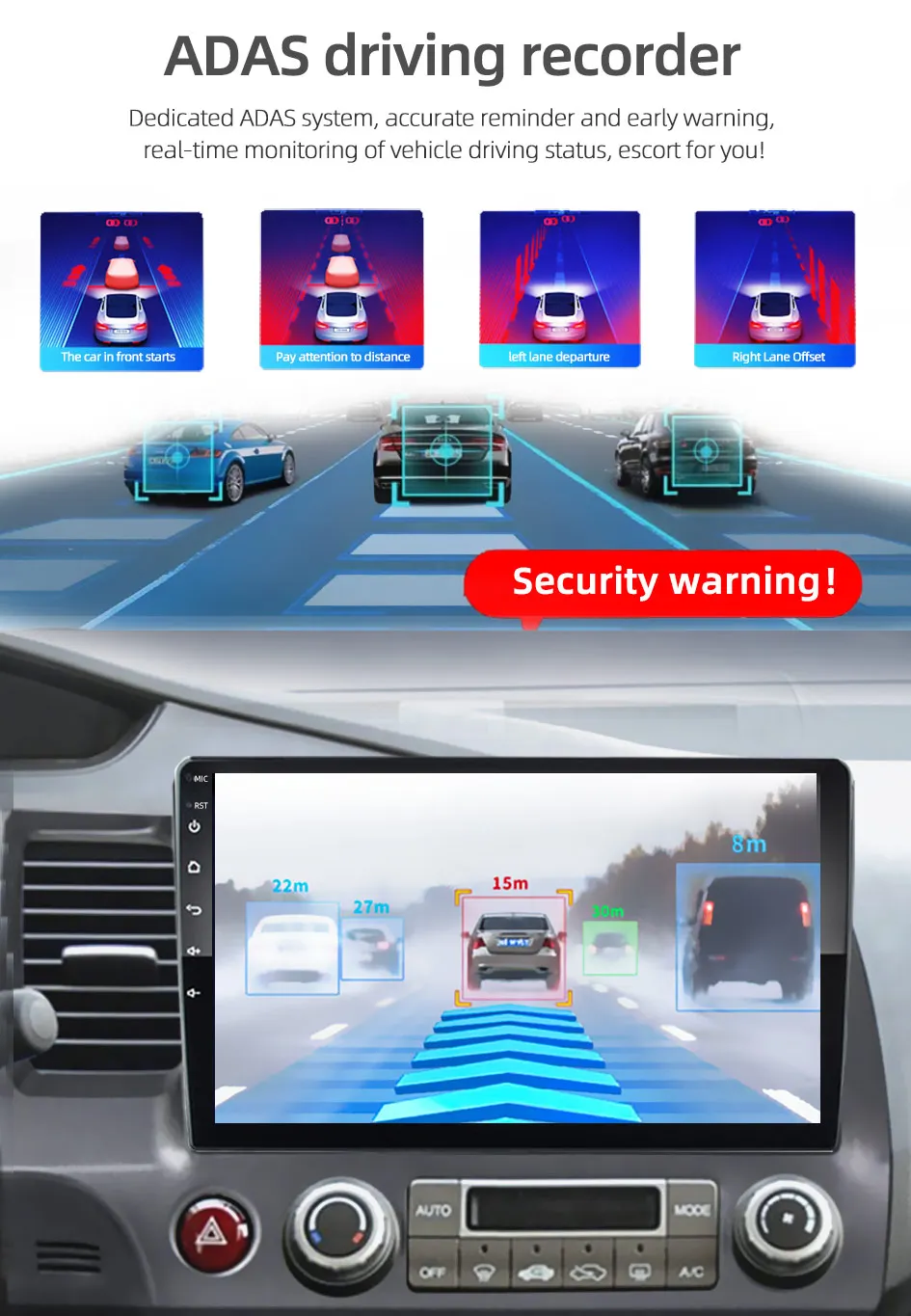 ADAS driving warning function, if you are too close to the vehicle in front or deviate from the current driving track, it will alarm and remind, making your driving safer!