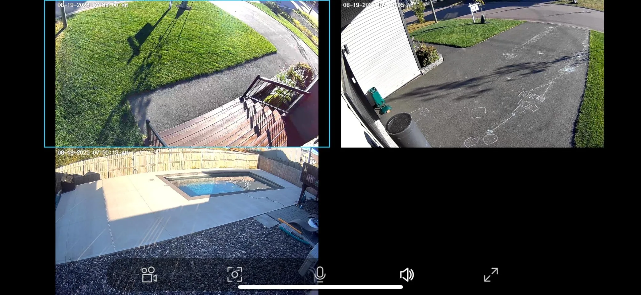 Four lens cameras simultaneously monitor four areas and display four images on a mobile application.