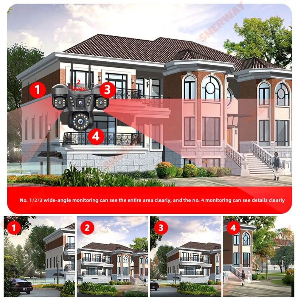 10K 20MP UHD Outdoor WiFi IP Camera Four Len Four Screen 360° 16X Zoom PTZ Security Cam Auto Tracking CCTV Wireless Surveillance