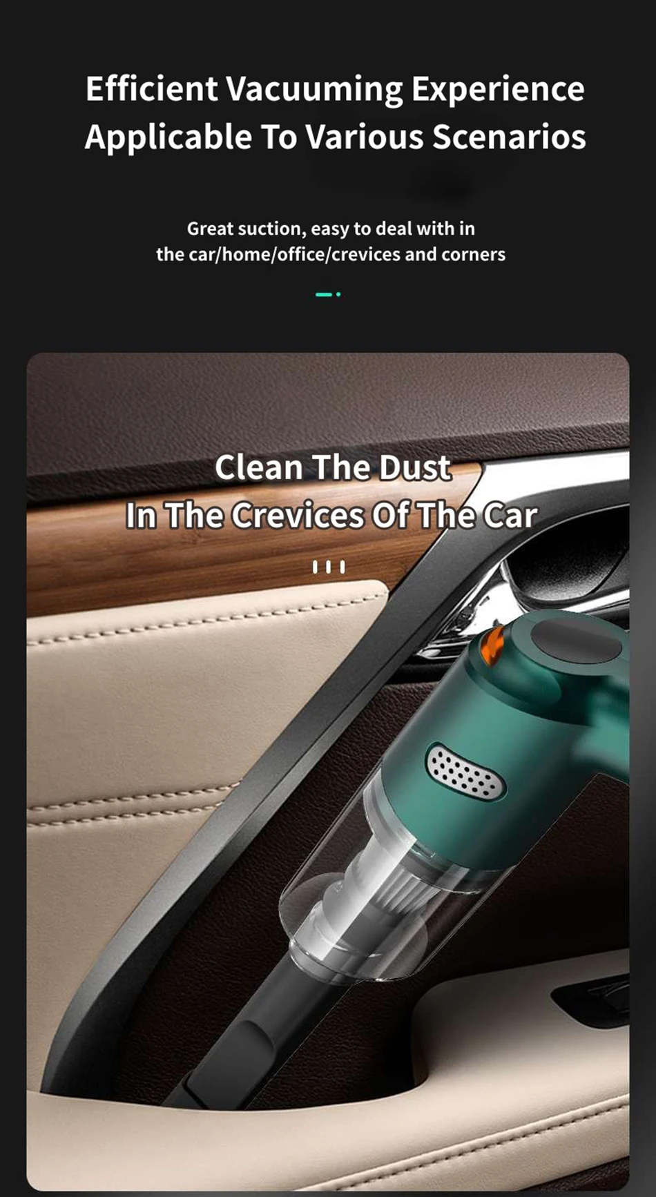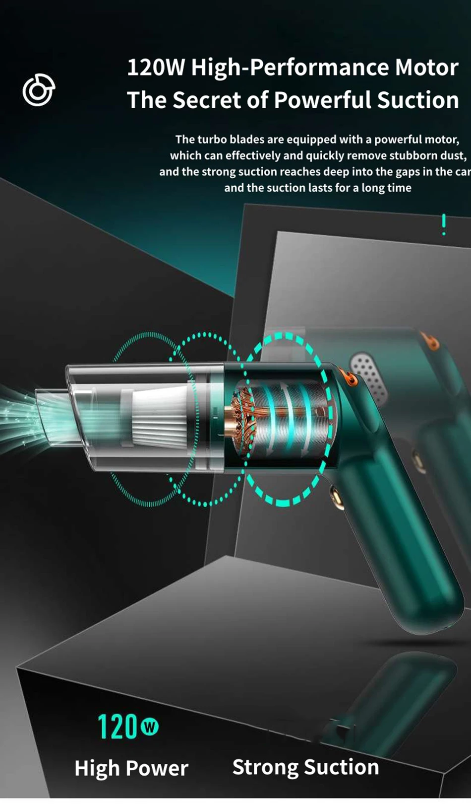 The Secret of Powerful Suction, The turbo blades are equipped with a powerful motor,which can effectively and quickly remove stubborn dust, and the strong suction reaches deep into the gaps in the car and the suction lasts for a long time
