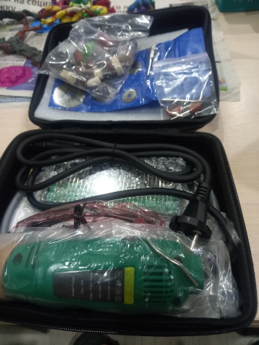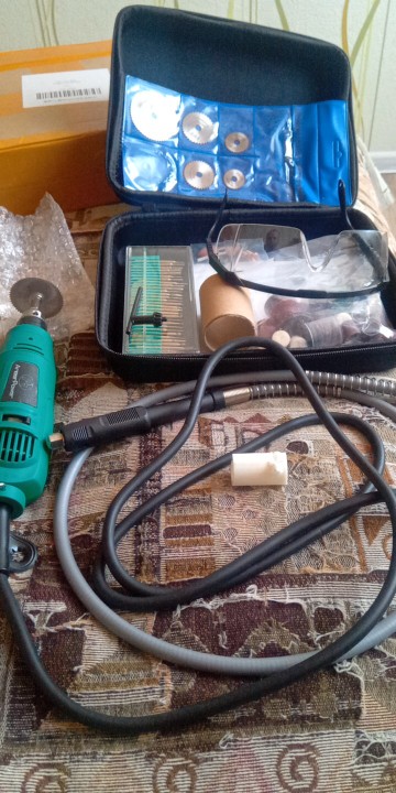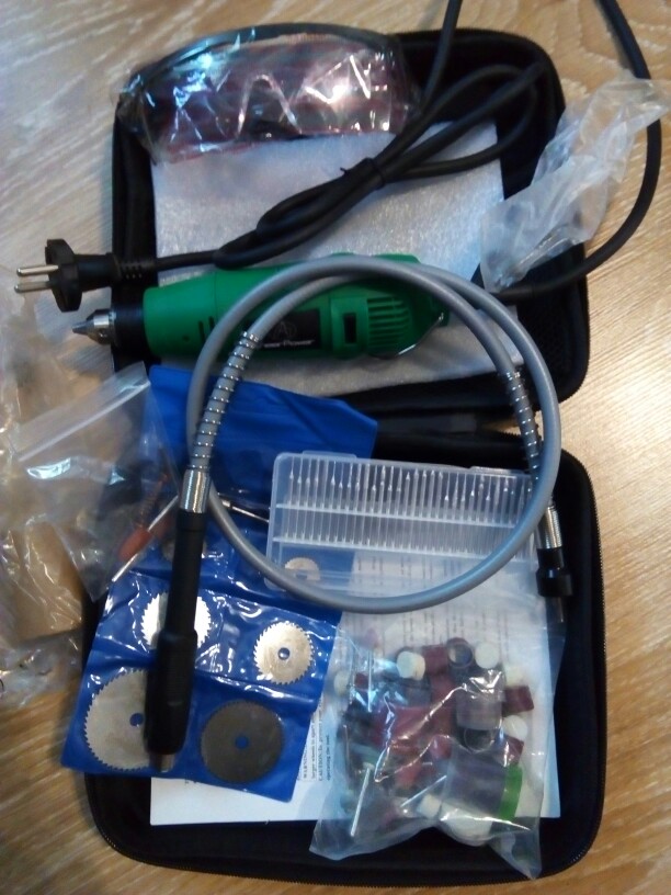 Set 2-the only one with a key for a flexible shaft. Everything, as in the description. Saw Blades-for plywood and thin plastic are good, but the power is little-the turnover drops when gnawed into the material. To a depth of 1mm saw without dropping speed. From the brush with metal springs, a pair of hairs flew off at medium turns-all of them immediately in trash, unsafe. Kameshek well sharpened scissors. You will need an additional case for storing attachments-they come all heaps in one package. Flexible shaft and a set of ravers-well, for a minute the work is slightly heated. The case is too small-it is necessary to strongly bend the wires, and the nozzles are tamped. The mechanism of turning on is smooth, but not very convenient-it would be better to step. Miracles do not wait-the device is suitable only for small short home work.