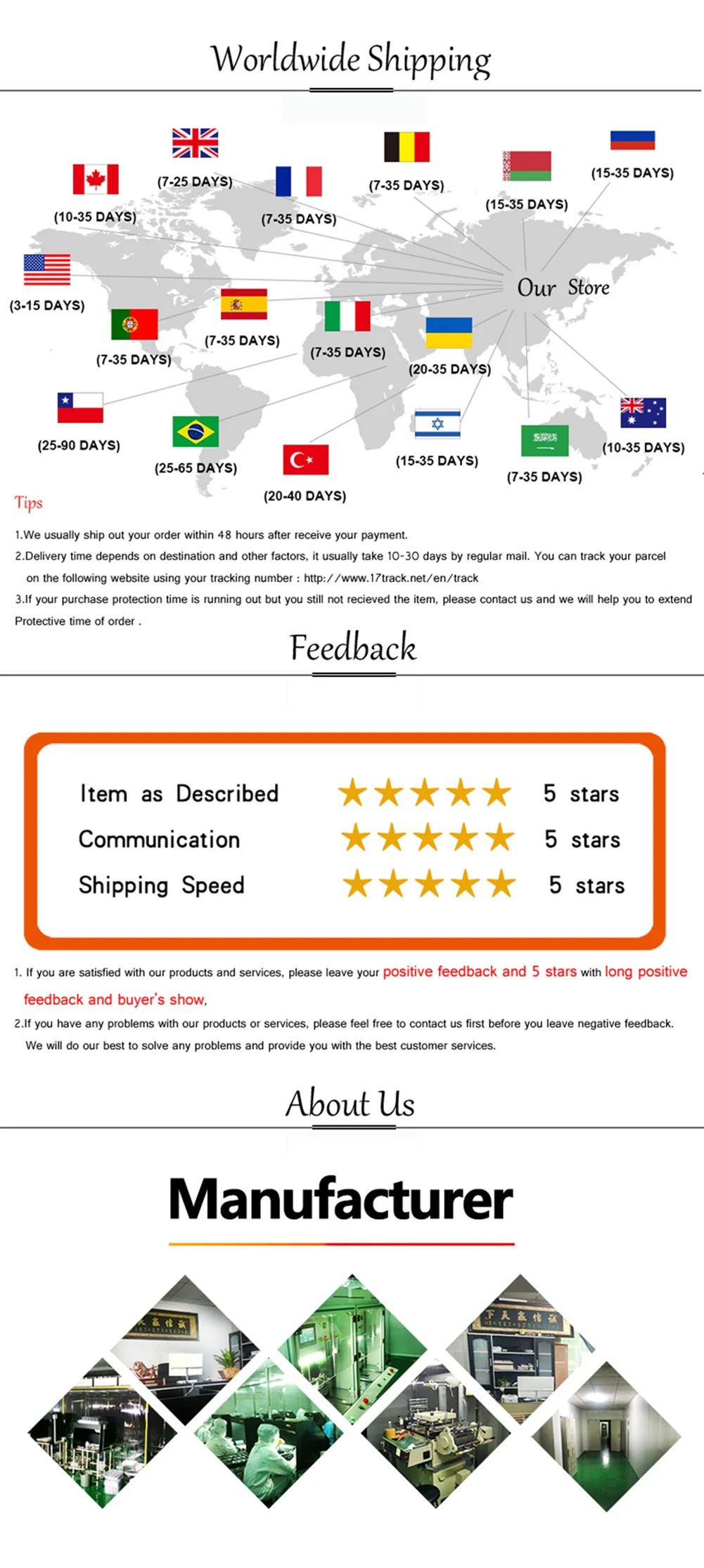 • If you did not receive the product within the guaranteed time( 45 days not including 2-5 day processing) you can request a refund or a reshipment.