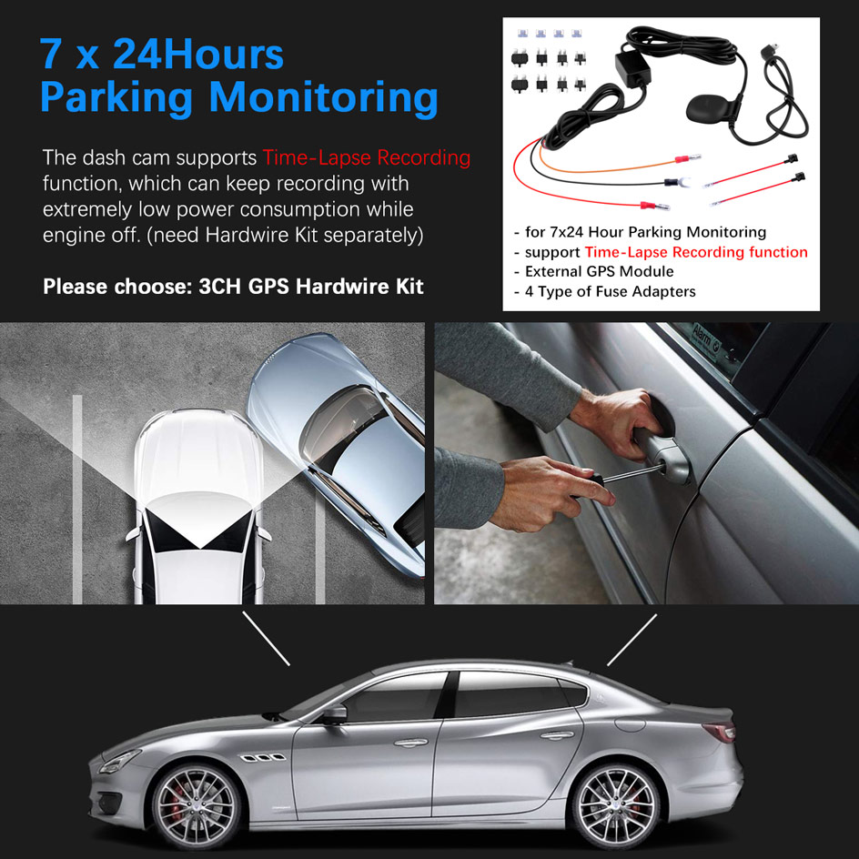 2. The dash cam supports Time-Lapse Recording function,which can keep recording with extremely low power consumption while engine off. (need purchase Special Hardwire Kit separately)