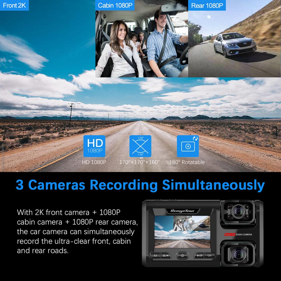 With 2K front camera + 1080P cabin camera + 1080P rear camera, the car camera can simultaneously record the ultra-clear front, cabin and rear roads.
