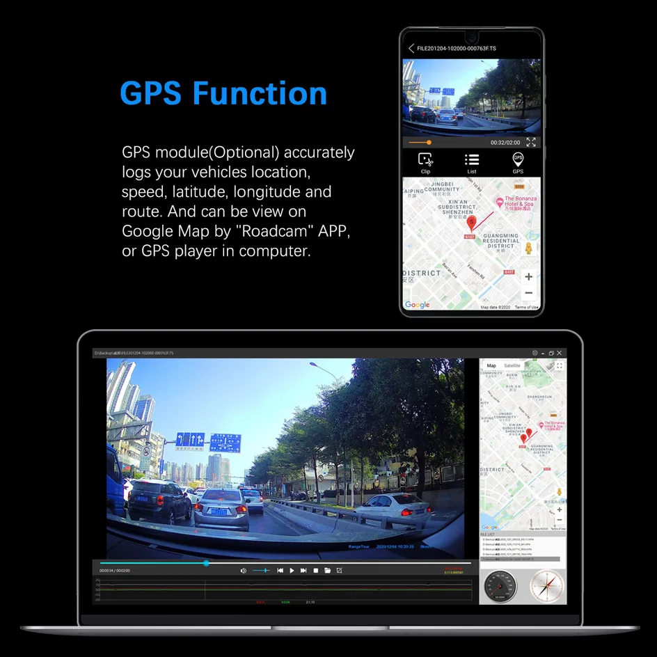 GPS module accurately logs your vehicles location, speed, latitude, longitude and route. And can be view on Google Map by “Roadcam” APP, or GPS player in computer.