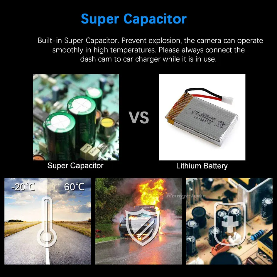 Built-in Super Capacitor. Prevent explosion, the camera can operate smoothly in high temperatures. Please always connect the dash camera to external power cord while it is in use. This dash cam has the “Auto Power Off” feature. When there is no external power connection, the dash cam will shut down, and time and date setting will be saved.