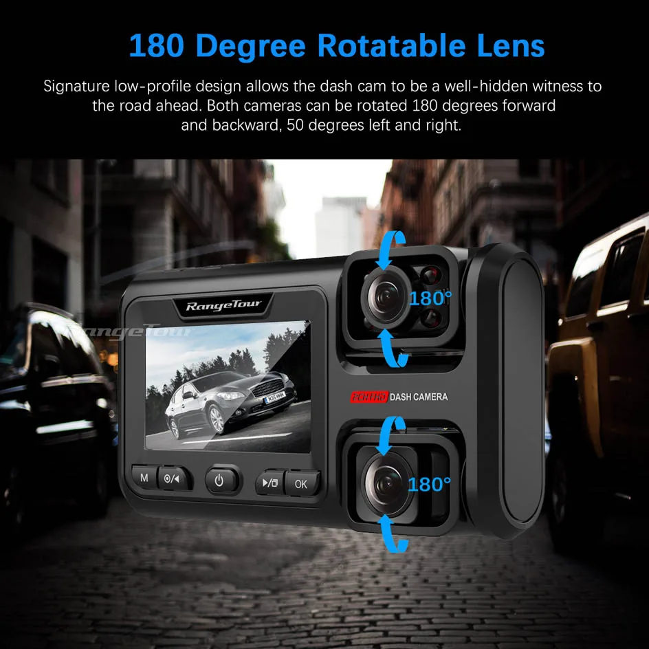 Signature low-profile design allows the dash camera to be a well-hidden witness to the road ahead. Both cameras can be rotated 180 degrees forward and backward, 50 degrees left and right.