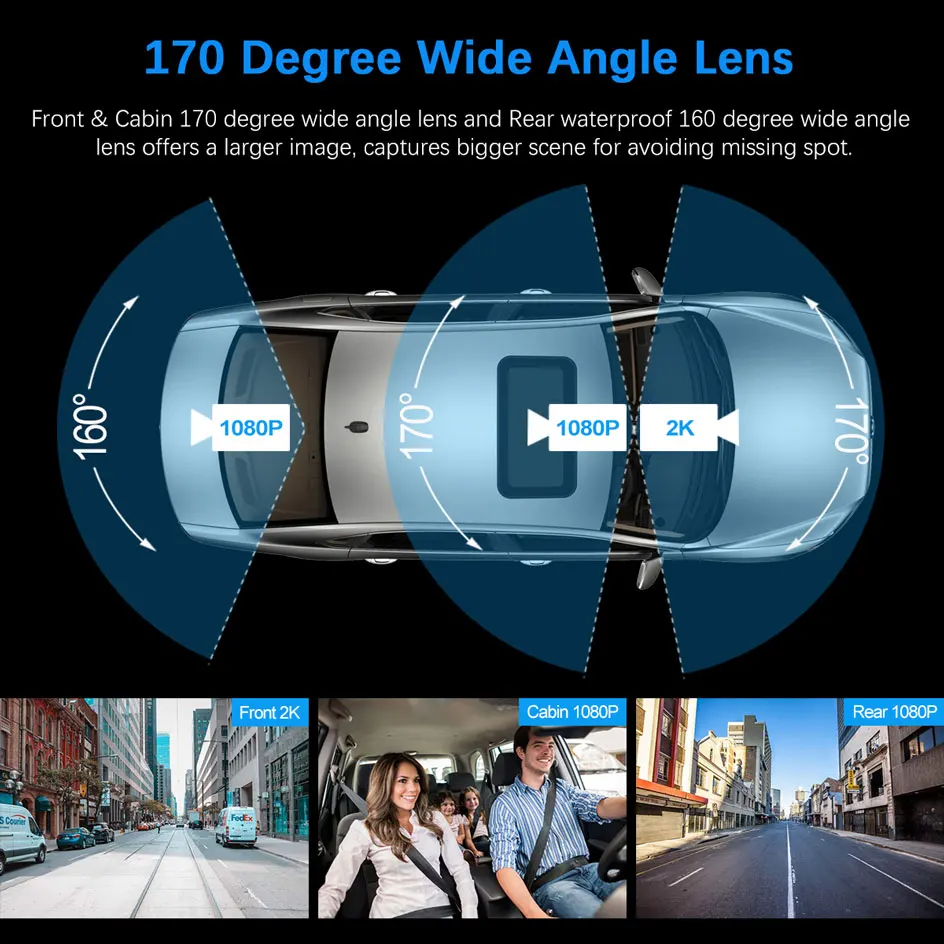 Front & Cabin 170 degree wide angle lens and Rear waterproof 160 degree wide angle lens offers a larger image, captures bigger scene for avoiding missing spot.
