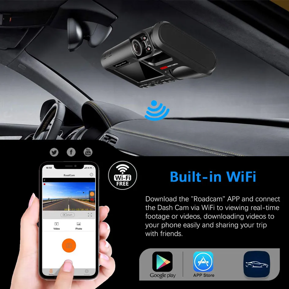 Download the “Roadcam” APP, and connect the Dash Cam via WiFi to viewing real-time footage or videos, downloading videos to your phone easily and sharing your trip with friends.