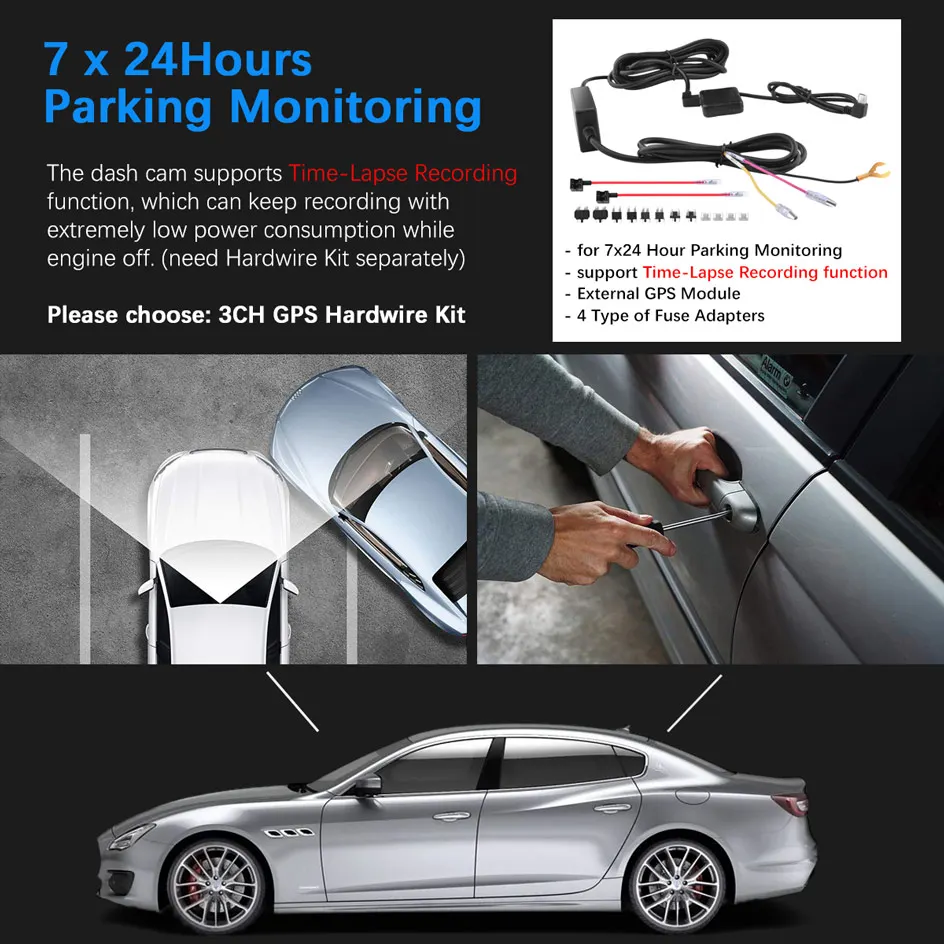 2. The dash cam supports Time-Lapse Recording function,which can keep recording with extremely low power consumption while engine off. (need purchase Special Hardwire Kit separately)
