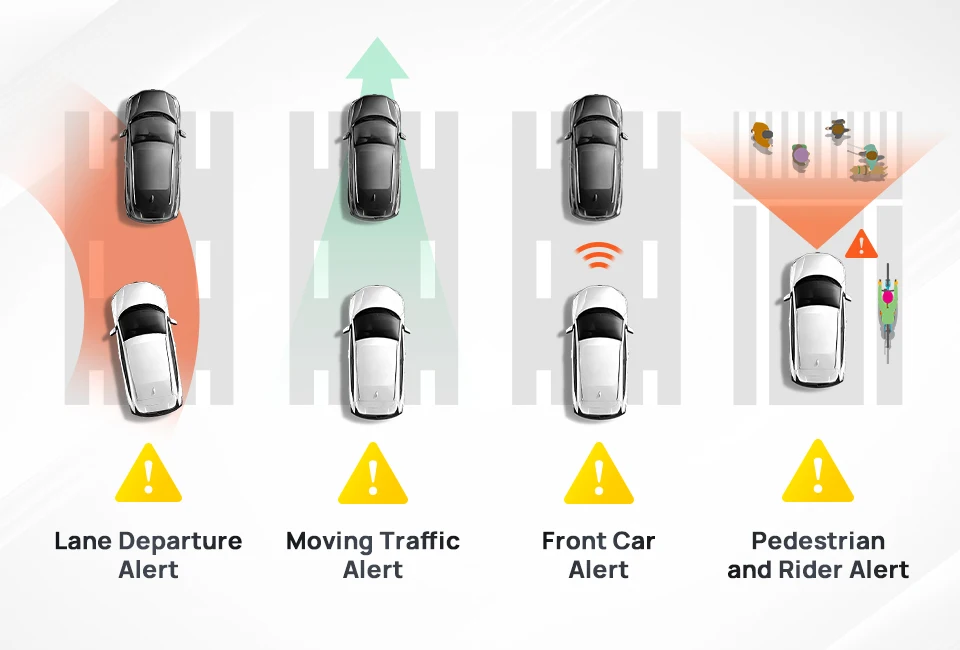 Expanded safety alerts including Pedestrian/Bikers Alert, Lane Departure Alert, Front Collision Alert and Moving Traffic Alert.