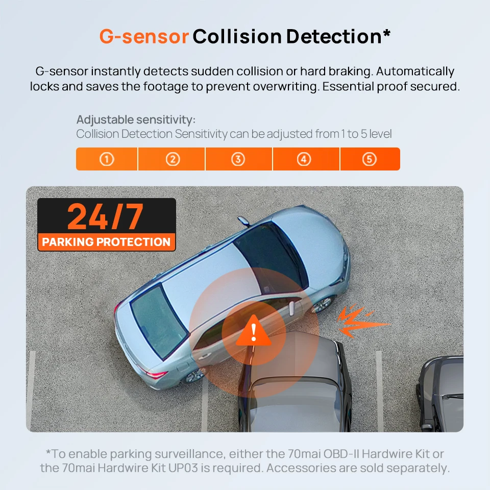 To enable parking surveillance, either the 70mai OBD-ll Hardwire Kit* or the 70mai Hardwire Kit UP03/UP06* is required.