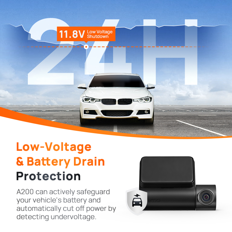When the vehicle battery voltage drops to a preset threshold, the power supply to the Dash Cam will be cut off to prevent low battery power, leading to the failure to start the vehicle.