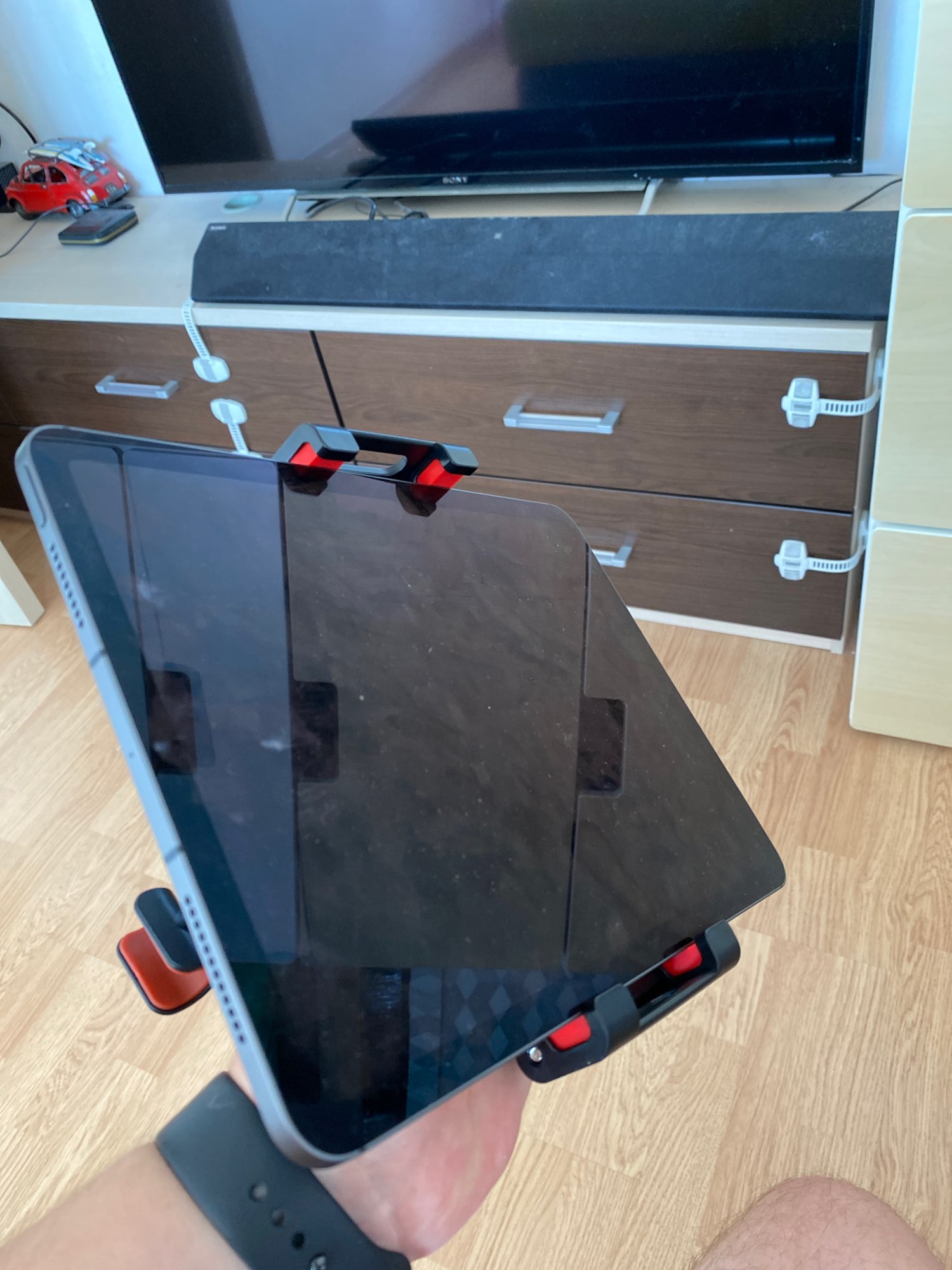 Easy to Assemble and attach. IPad Air keeps securely. On the asphalt without problems, in here on the not even road vibration is possible. The goods are excellent!!!