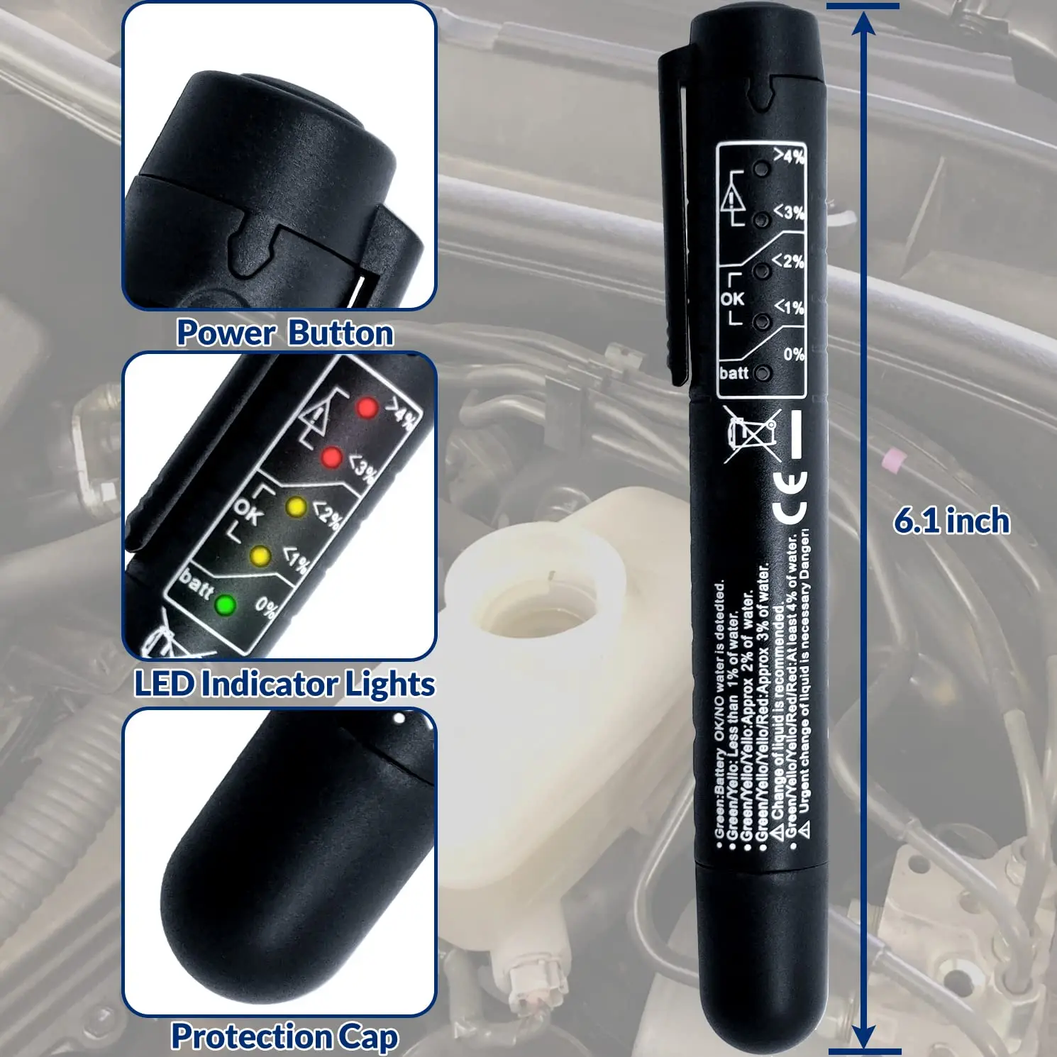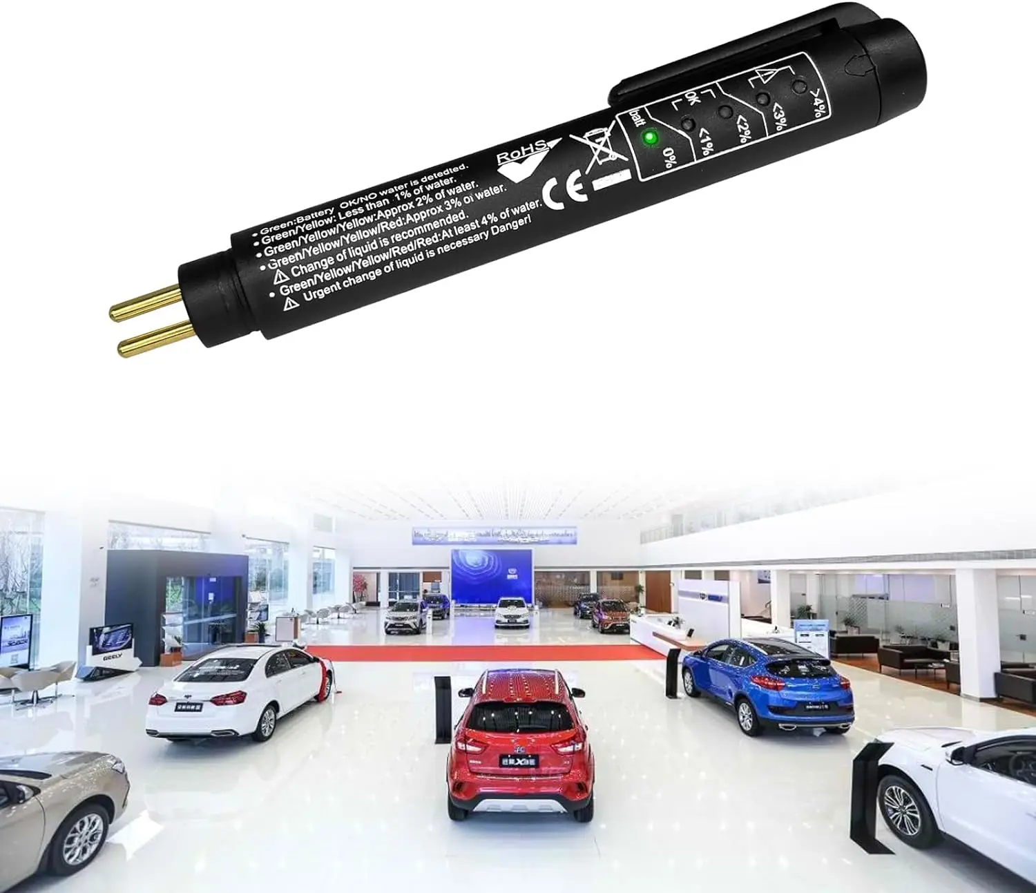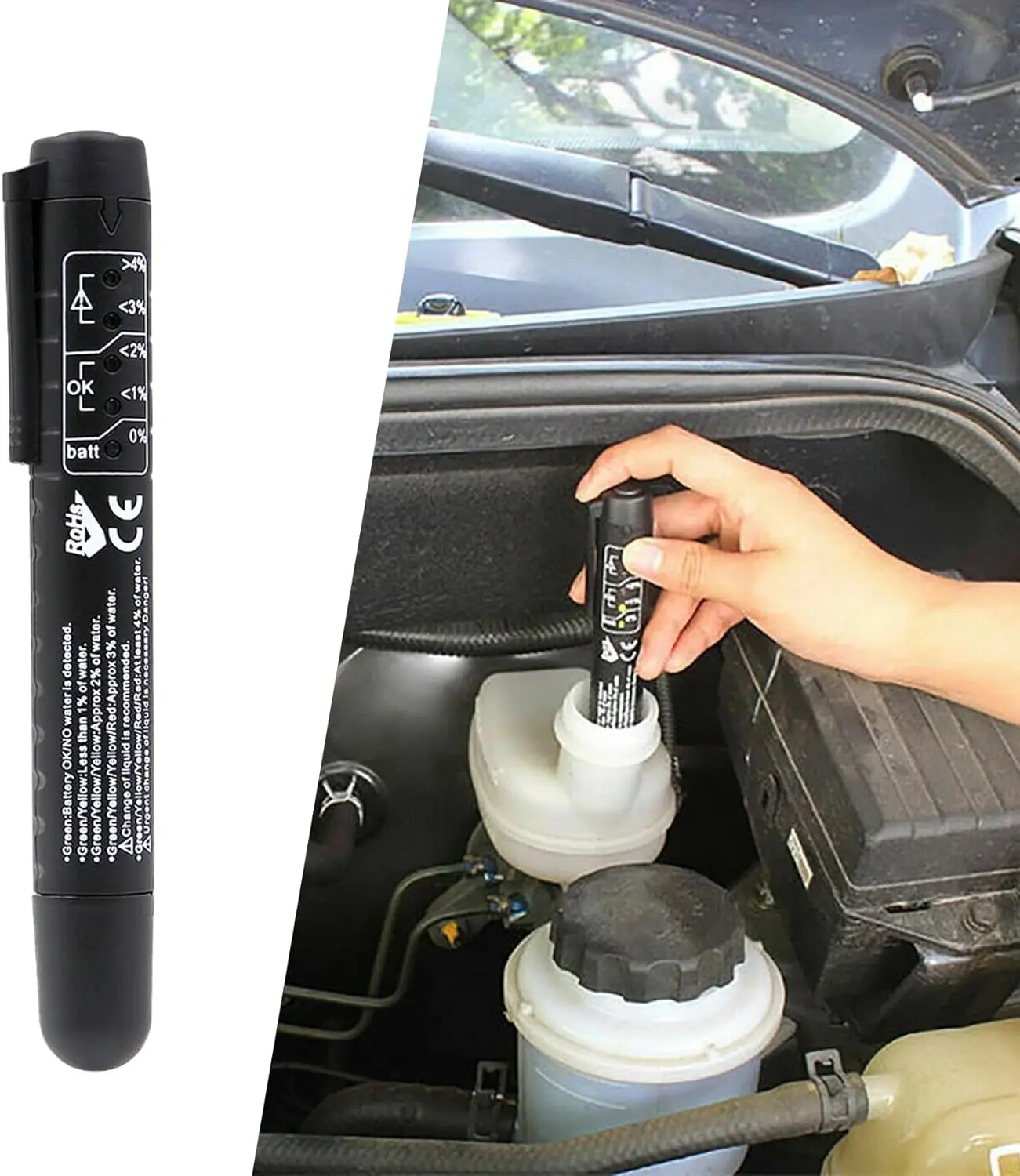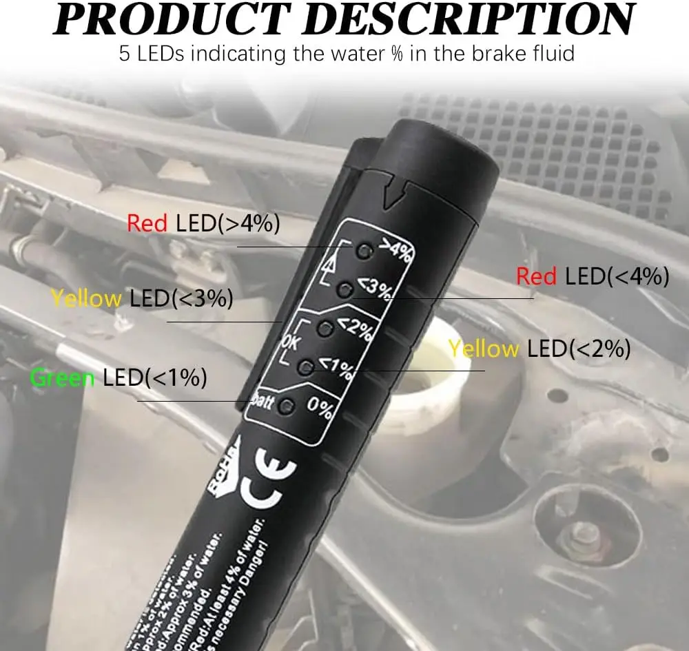 Step 3. Dip the test probe into the brake fluid and the LED light will indicate the percentage of water in the brake fluid.