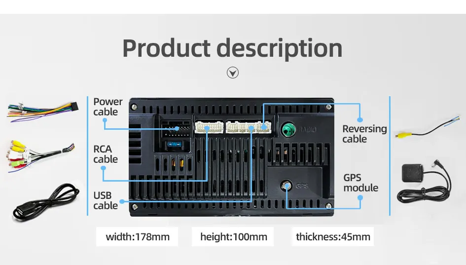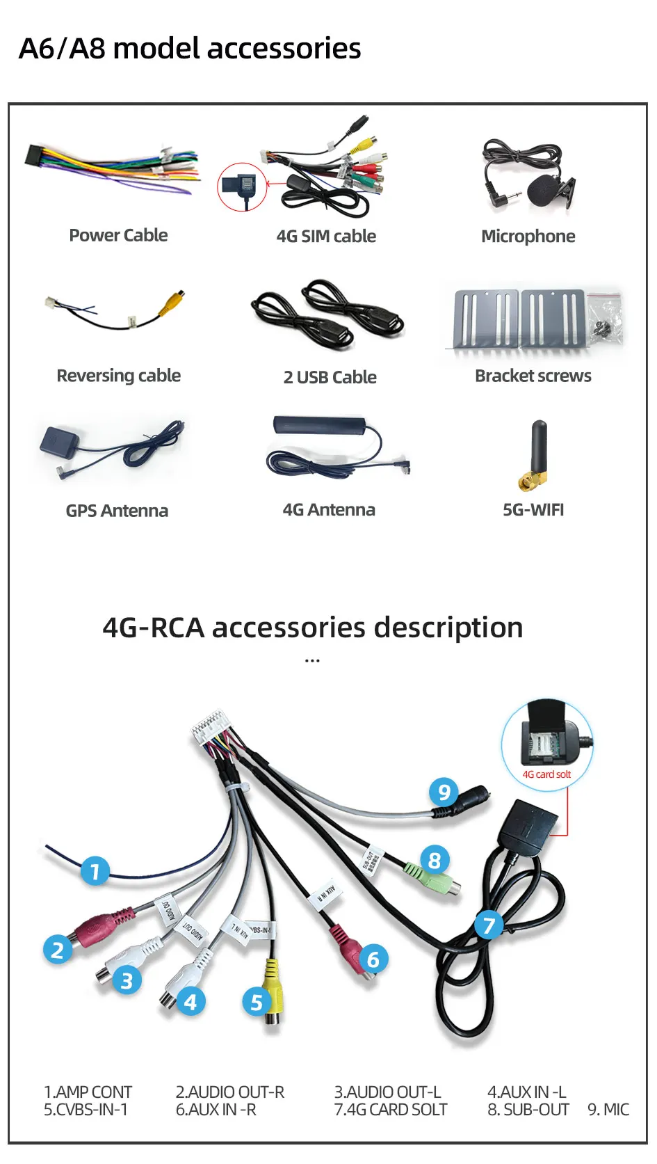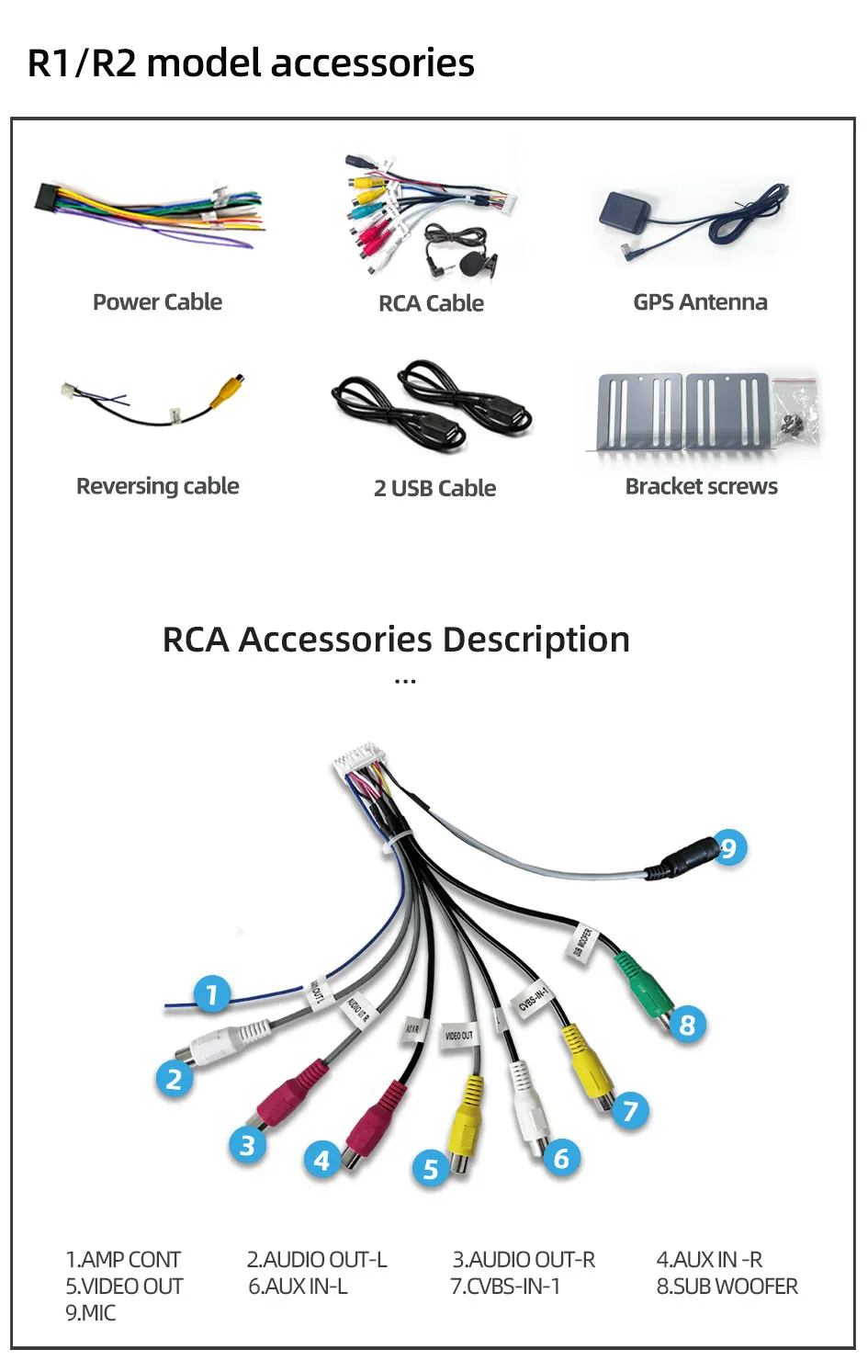 Power Cable、RCA Input/Output、GPS Antenna、reversing cable、USB Cable*2 、Bracket screws