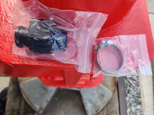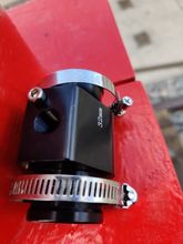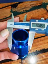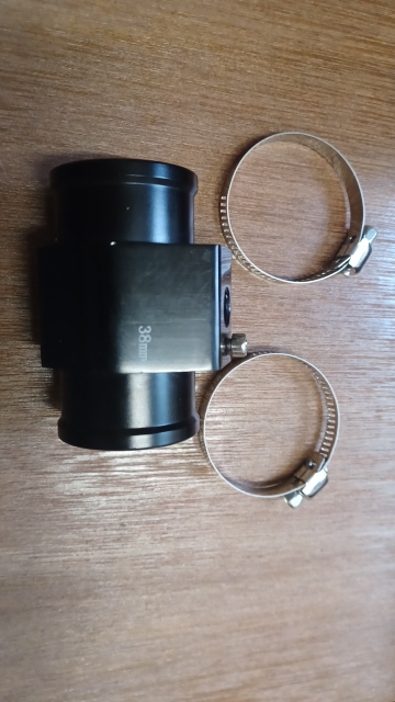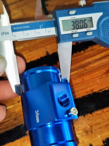 38mm at the widest point, the hose fitting is actually about 36mm where the clamp fits. Nicely made.