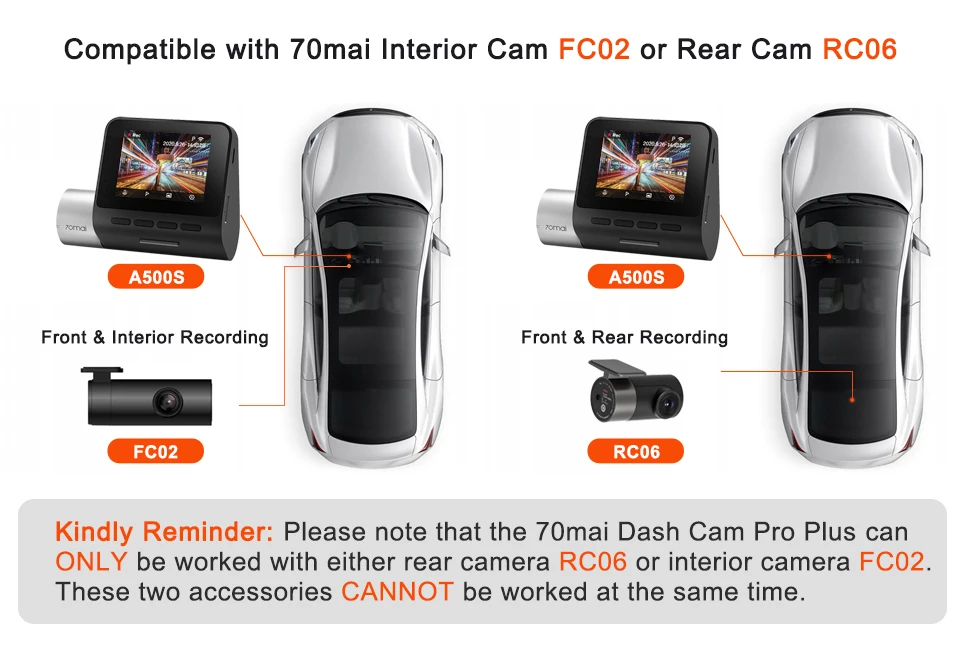 2. For 70mai Interior Dash Cam FC02 and 70mai Rear Cam RC06/RC09, cannot be used at the same time.Because there is only one port on the A500S/A800S/A400.