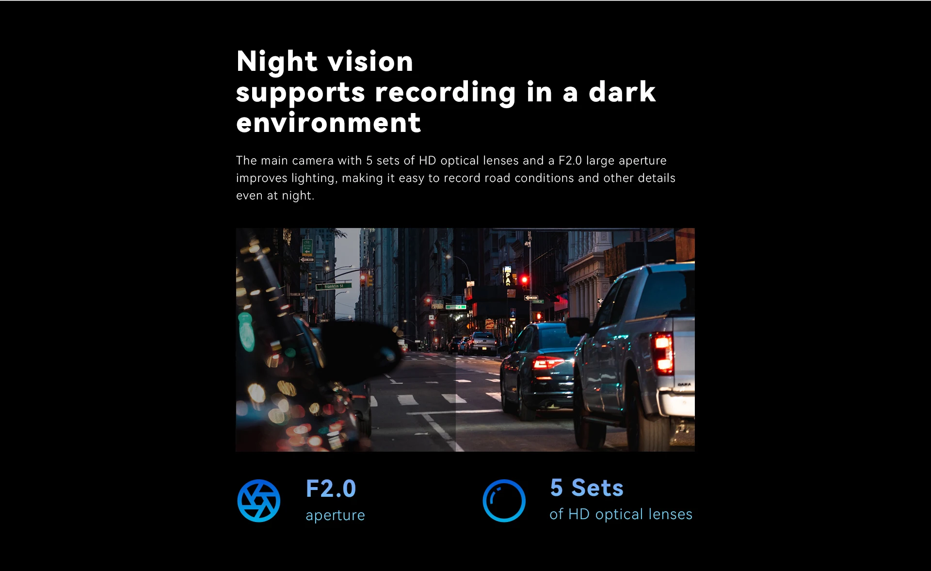 The main camera with 5 sets of HD optical lenses and a F2.0 large aperture improves lighting, making it easy to record road conditions and other details even at night.