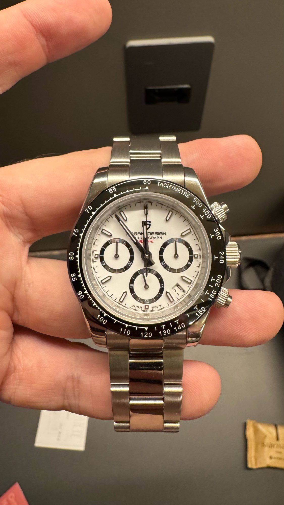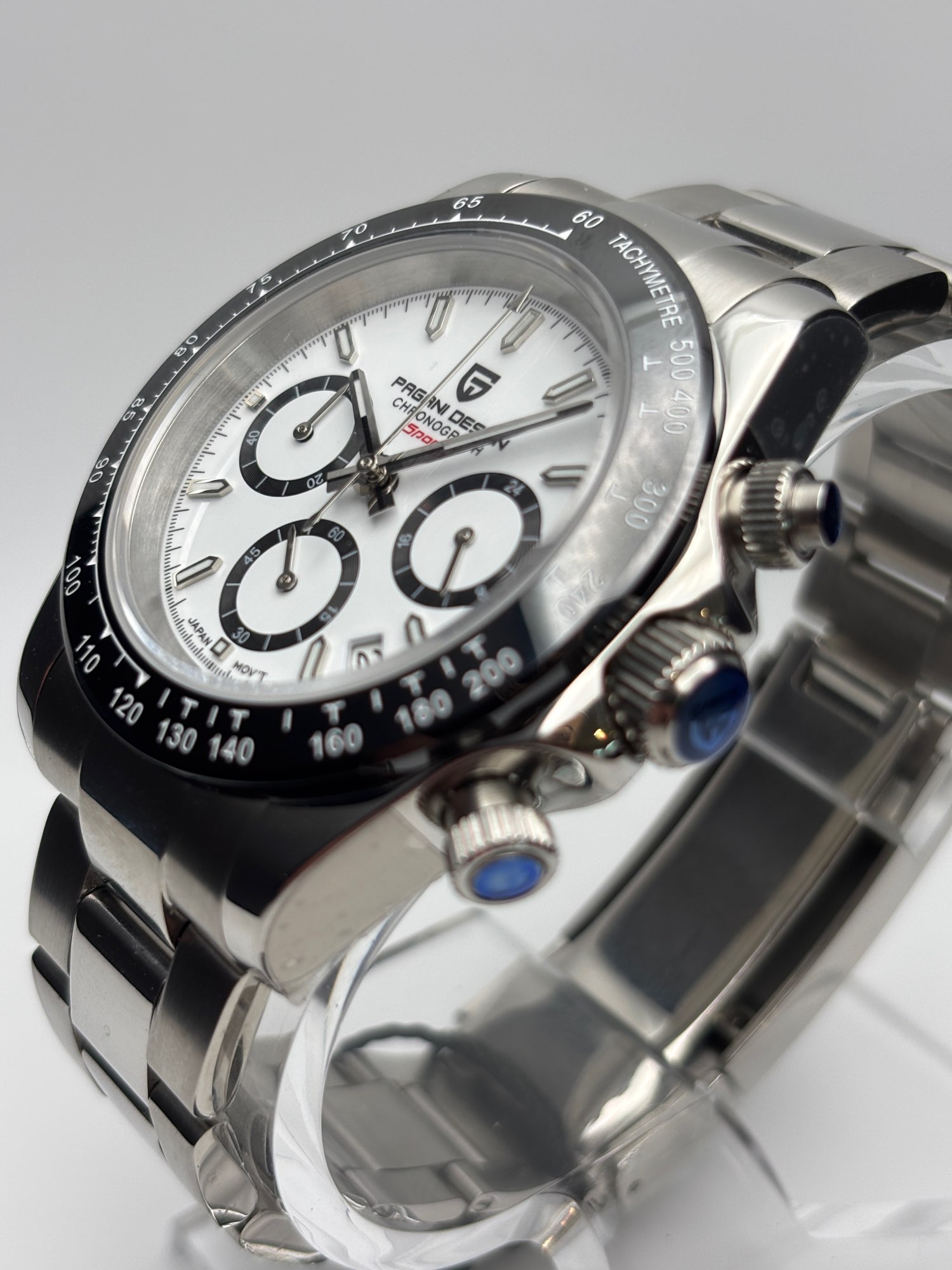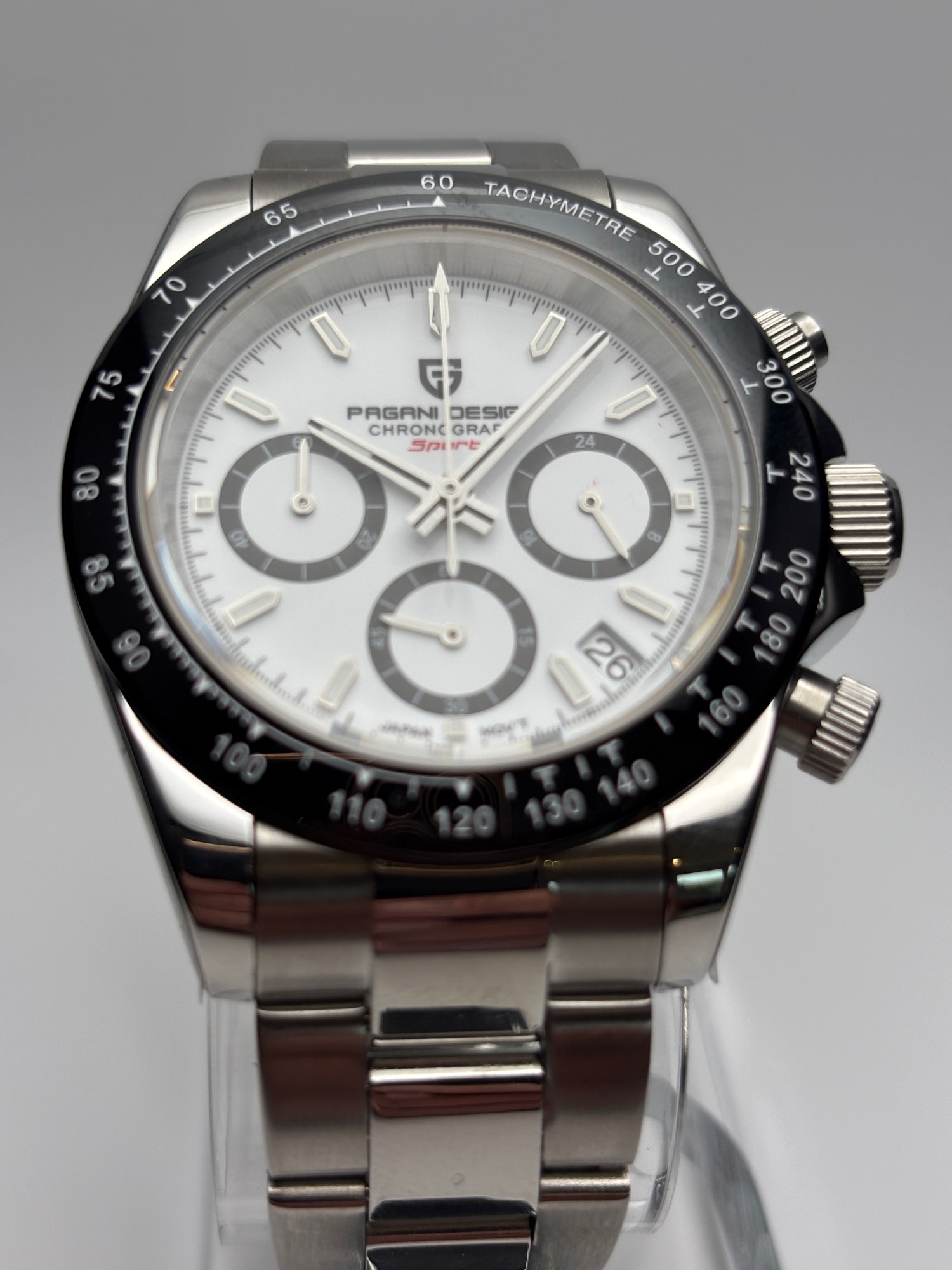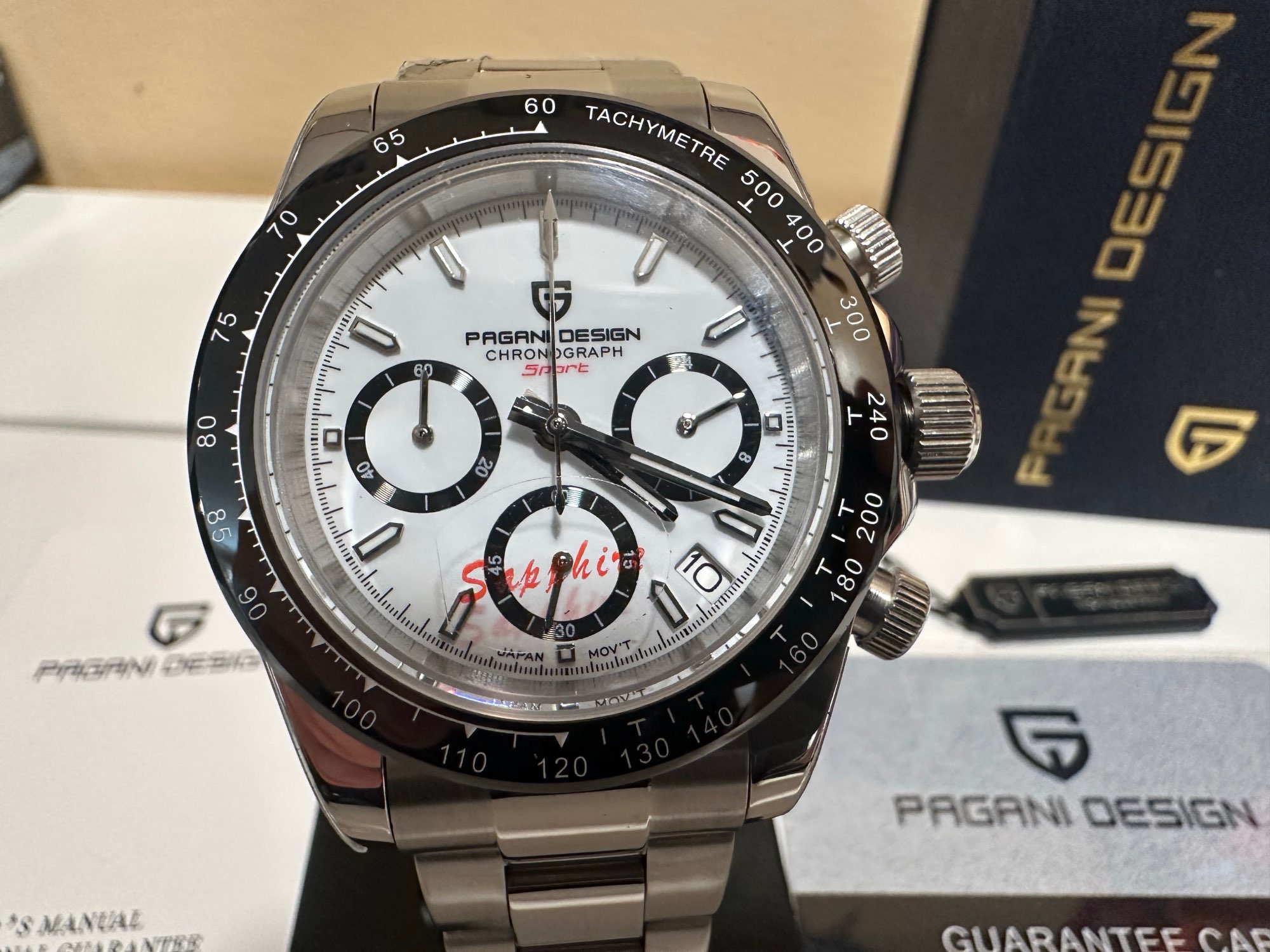 This 40mm pagani design chronograph is outstanding value! The daytona-inspired styling is executed with impressive attention to detail - particularly the functional screw-down crowns that give it a genuinely premium feel. Sapphire crystal provides excellent clarity and scratch resistance. The stainless steel case and bracelet have precise finishing with no rough edges. Chronograph functions work smoothly and the quartz movement is extremely accurate. Arrived quickly with excellent packaging and the seller communication was prompt and helpful. For the price point, the quality is remarkable - looks substantially more expensive than it is. Perfect addition for collectors who appreciate the classic racing chronograph aesthetic without the luxury price tag.