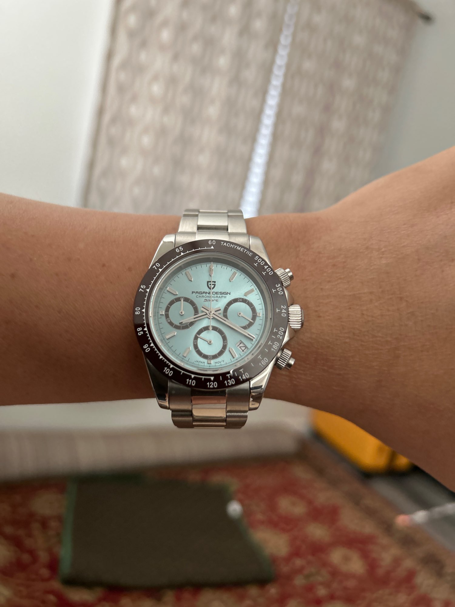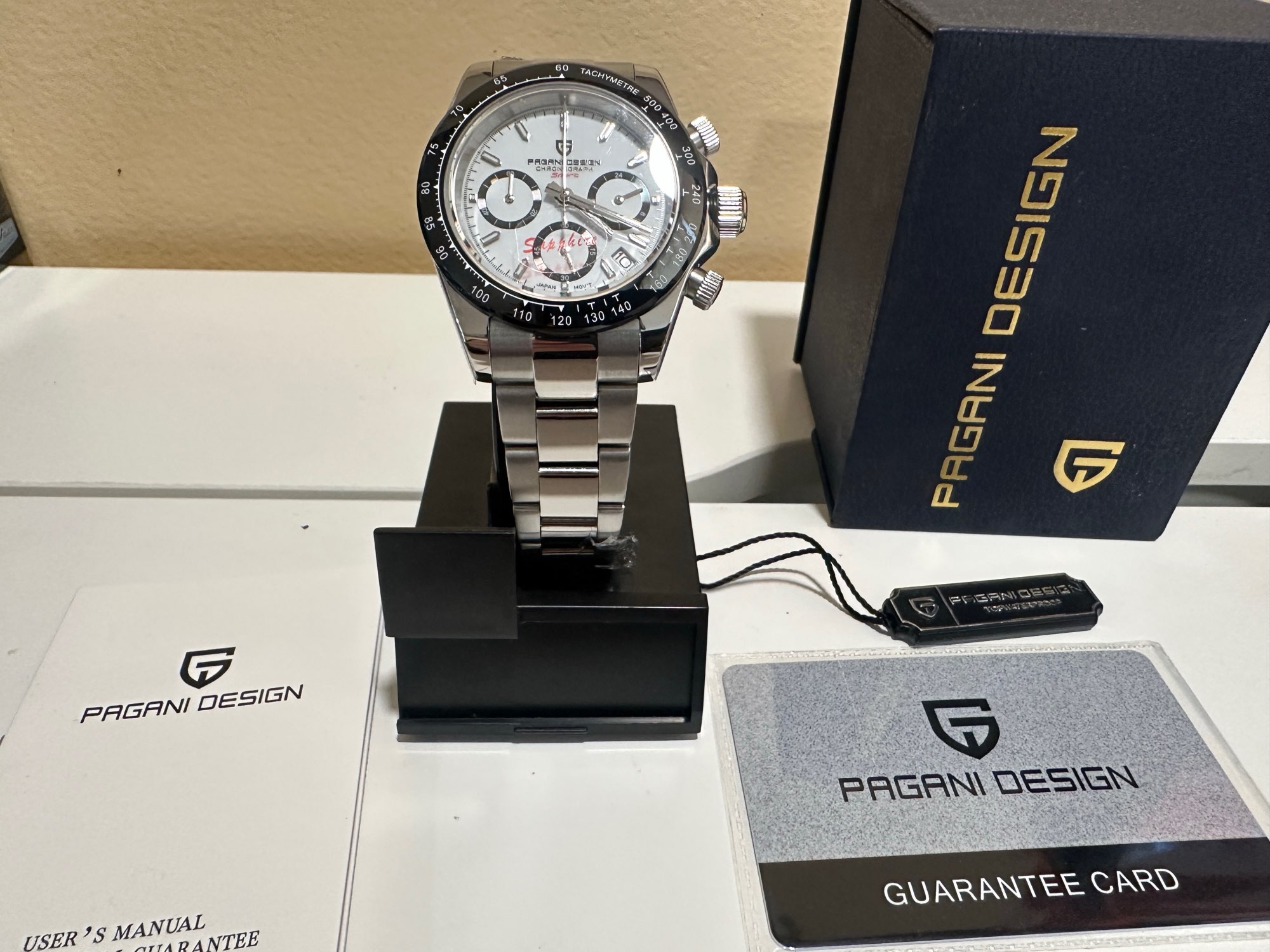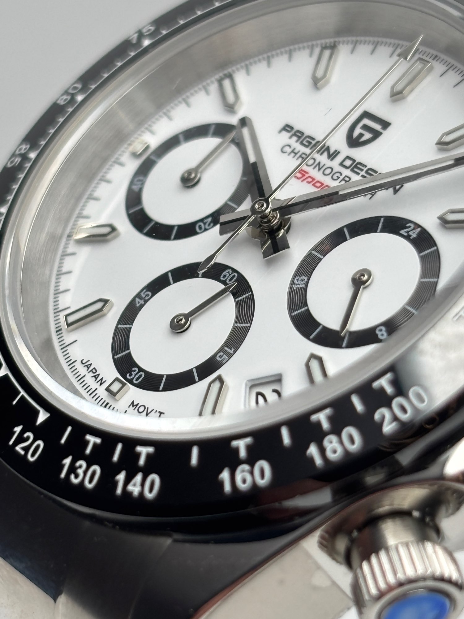 This 40mm pagani design chronograph is outstanding value! The daytona-inspired styling is executed with impressive attention to detail - particularly the functional screw-down crowns that give it a genuinely premium feel. Sapphire crystal provides excellent clarity and scratch resistance. The stainless steel case and bracelet have precise finishing with no rough edges. Chronograph functions work smoothly and the quartz movement is extremely accurate. Arrived quickly with excellent packaging and the seller communication was prompt and helpful. For the price point, the quality is remarkable - looks substantially more expensive than it is. Perfect addition for collectors who appreciate the classic racing chronograph aesthetic without the luxury price tag.
