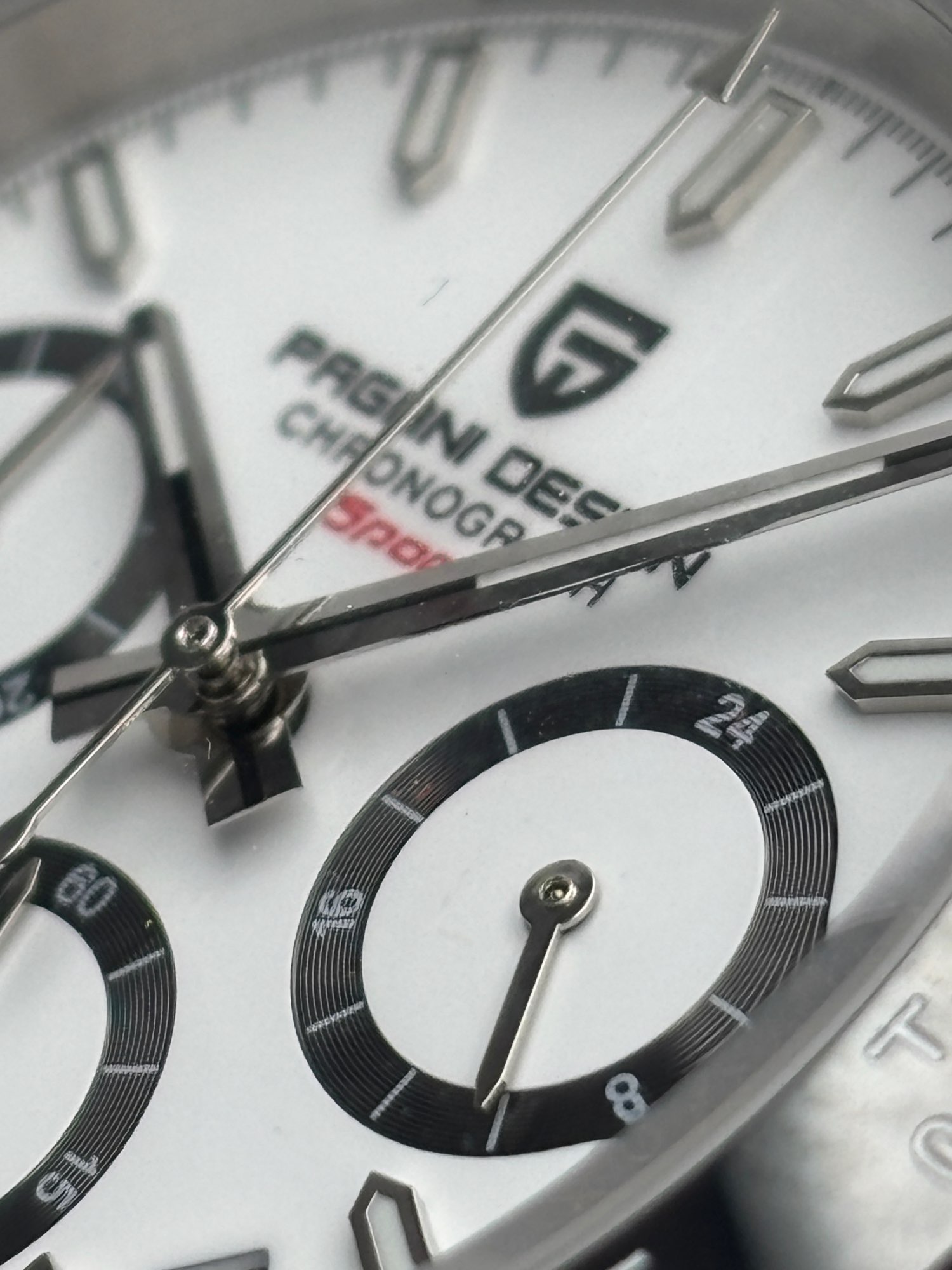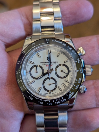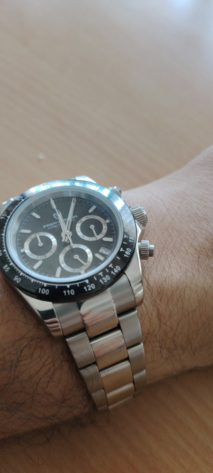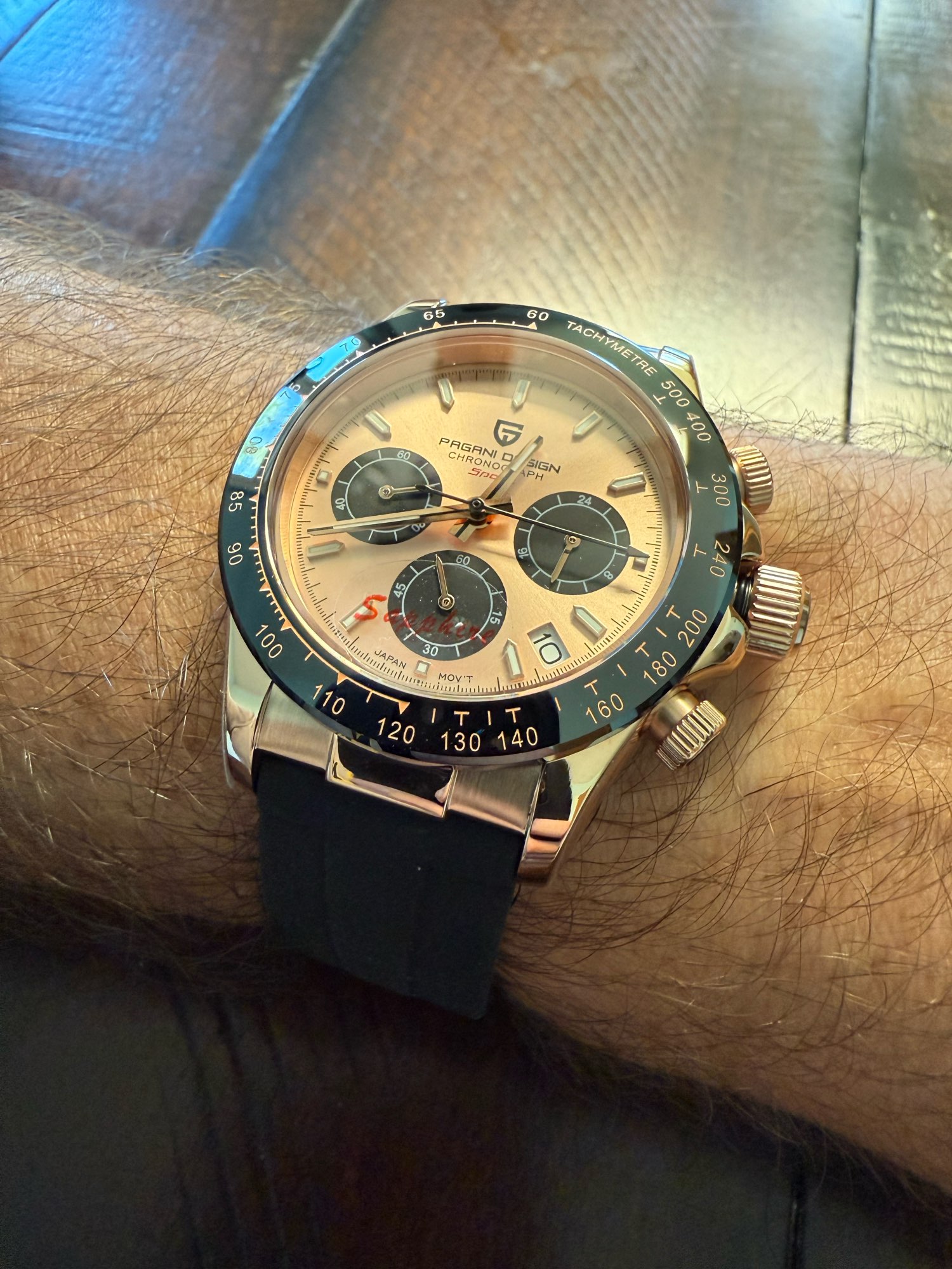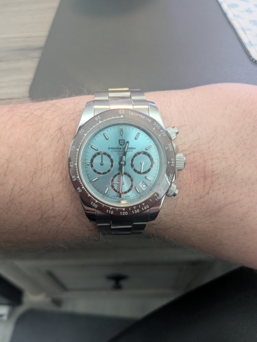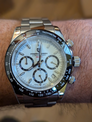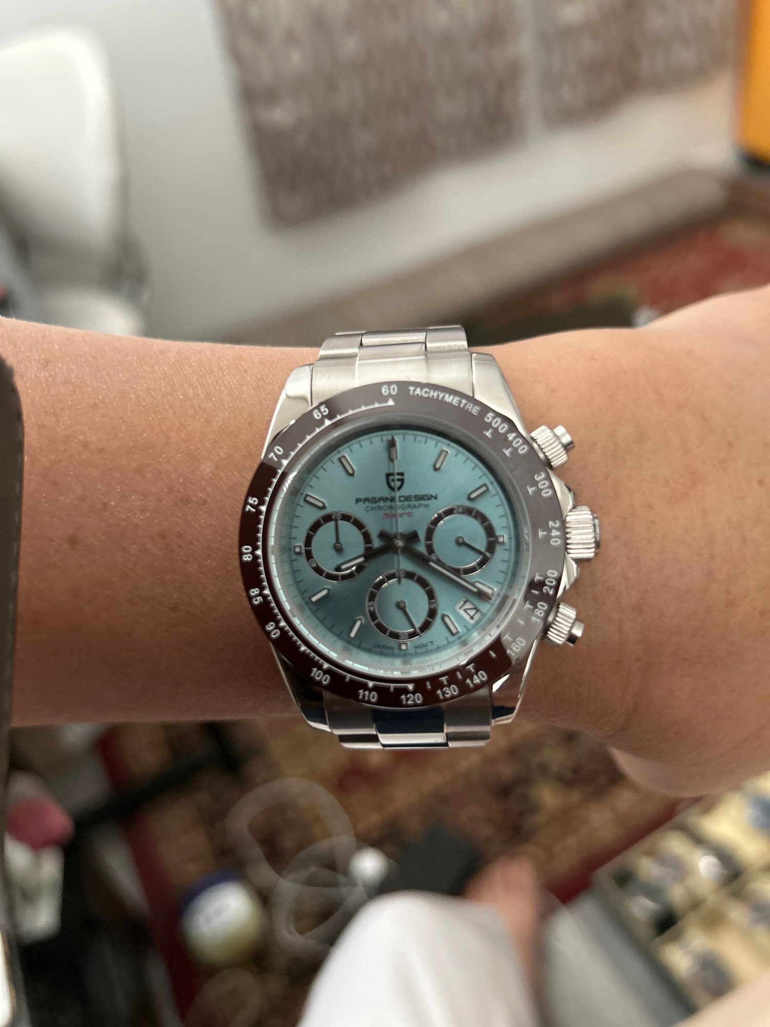 This 40mm pagani design chronograph is outstanding value! The daytona-inspired styling is executed with impressive attention to detail - particularly the functional screw-down crowns that give it a genuinely premium feel. Sapphire crystal provides excellent clarity and scratch resistance. The stainless steel case and bracelet have precise finishing with no rough edges. Chronograph functions work smoothly and the quartz movement is extremely accurate. Arrived quickly with excellent packaging and the seller communication was prompt and helpful. For the price point, the quality is remarkable - looks substantially more expensive than it is. Perfect addition for collectors who appreciate the classic racing chronograph aesthetic without the luxury price tag.