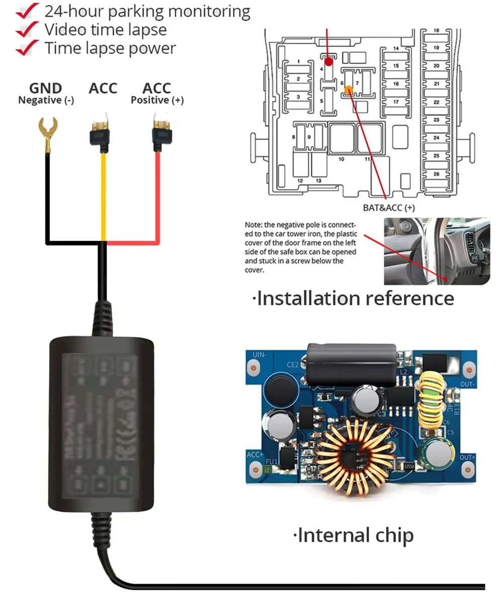 Car stops, security never stops. Time-Lapse mode enables around-the-clock recording; G-Sensor mode automatically records when motion& impact is detected. Leave your car in safe hands under either mode.(Need to use Buck Line)Buck line