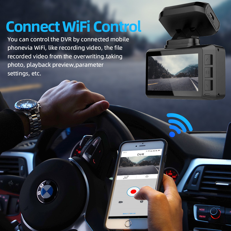 You can control the DVR by connected mobile phonevia WiFi, like recording video, the file recorded video from the overwriting.taking photo, playback preview,parameter settings, etc.