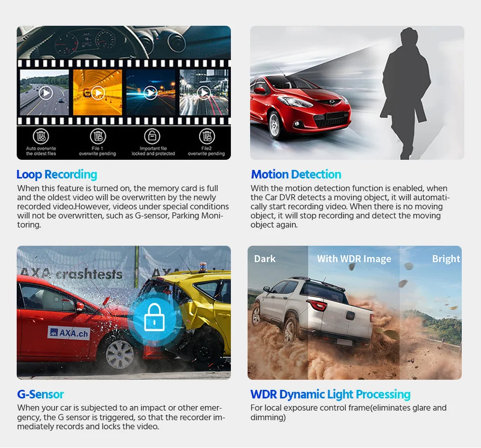 7-About Video: Our Car DVR is FHD 1080P Video Recorder,must use high quality Class 10 TF Card, any low quality/low speed TF card all can’t support our DVRs work normally, if you can’t make sure you have good TF Card,please buy our Original TF Card together.