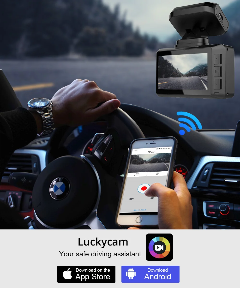 You can control the DVR by connected mobile phonevia WiFi, like recording video, the file recorded video from the overwriting.taking photo, playback preview,parameter settings, etc.