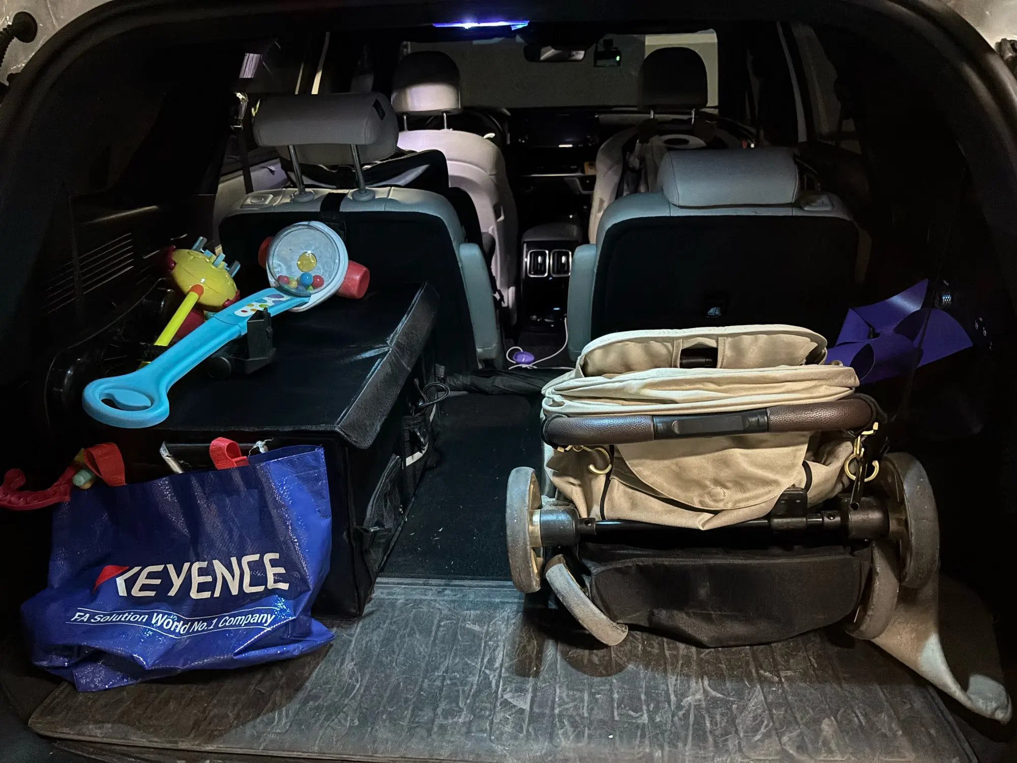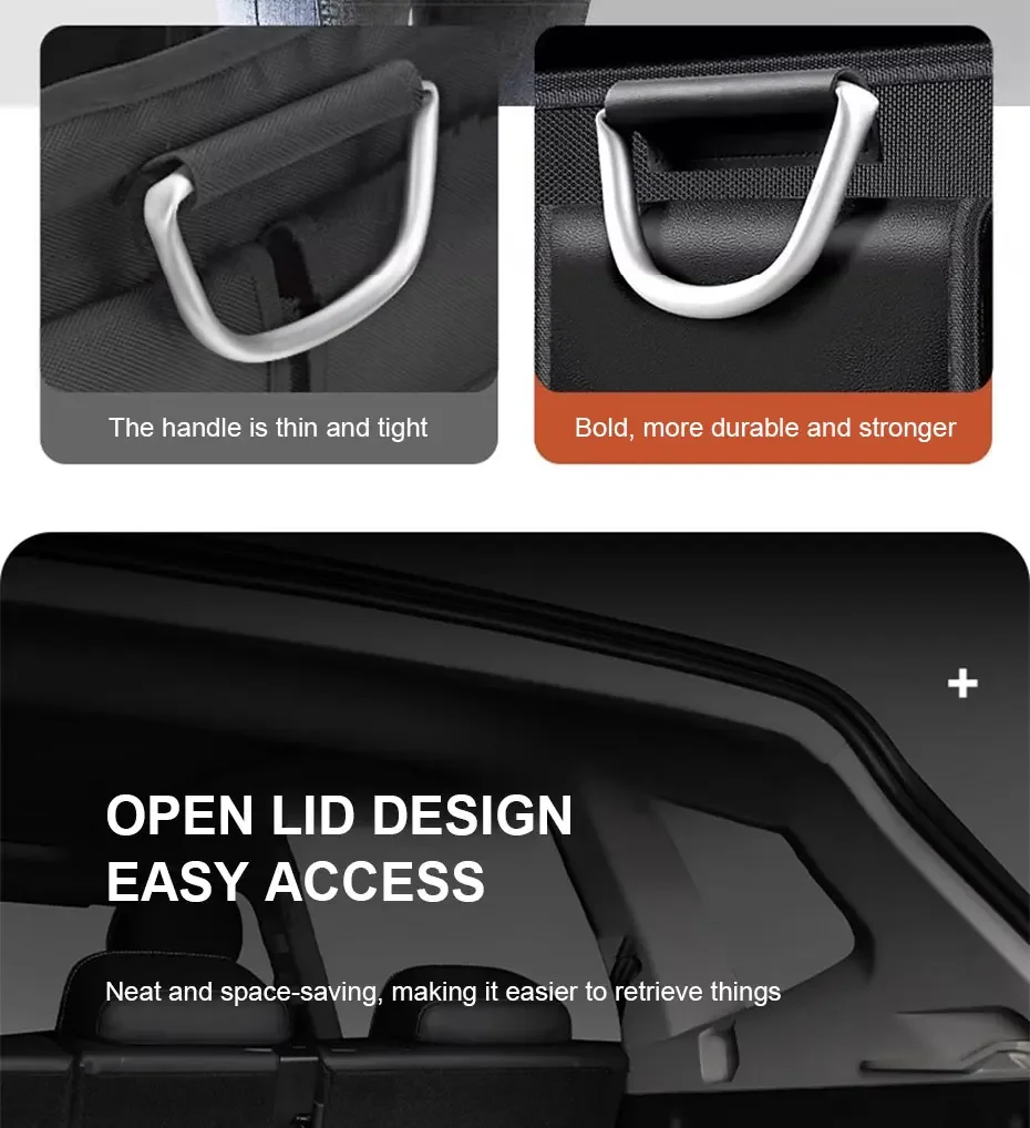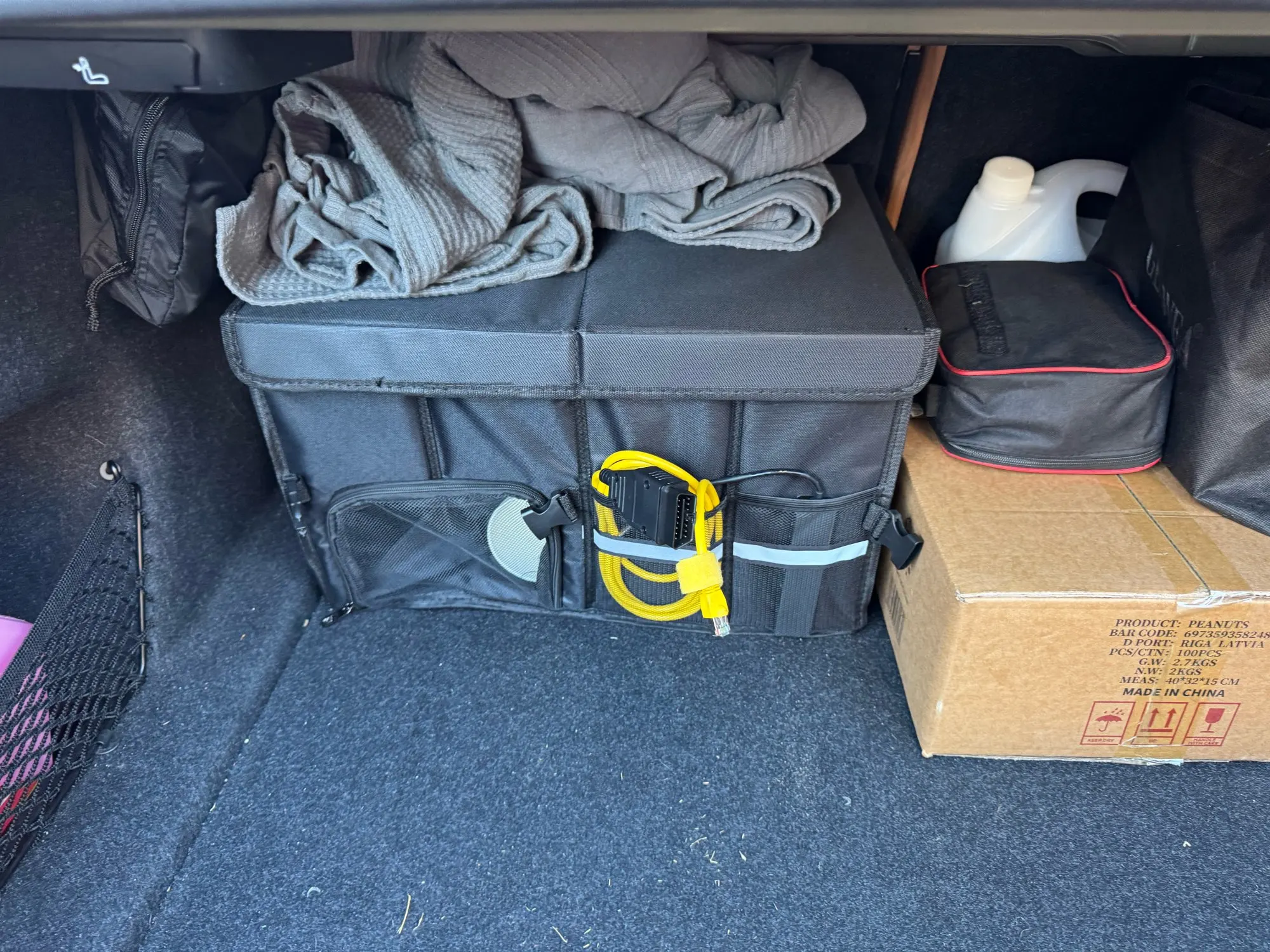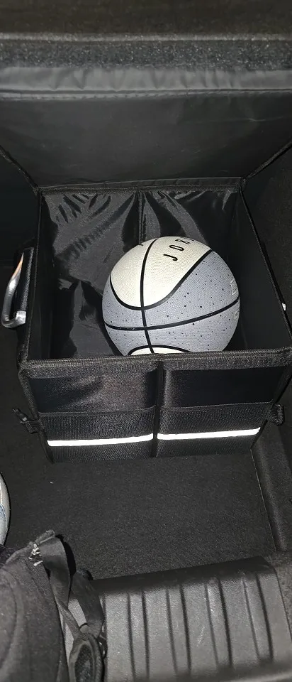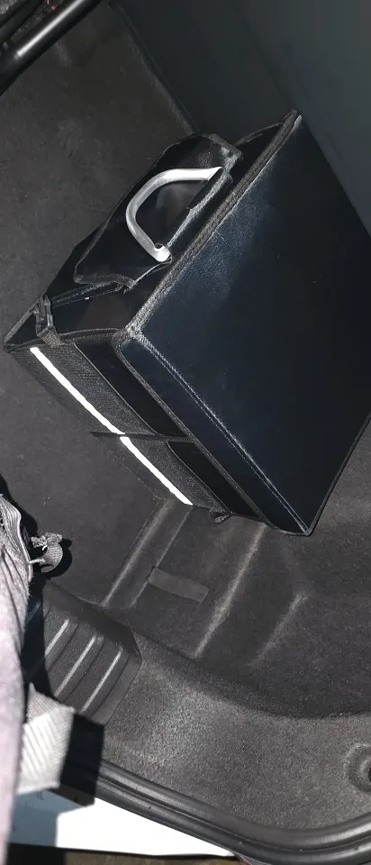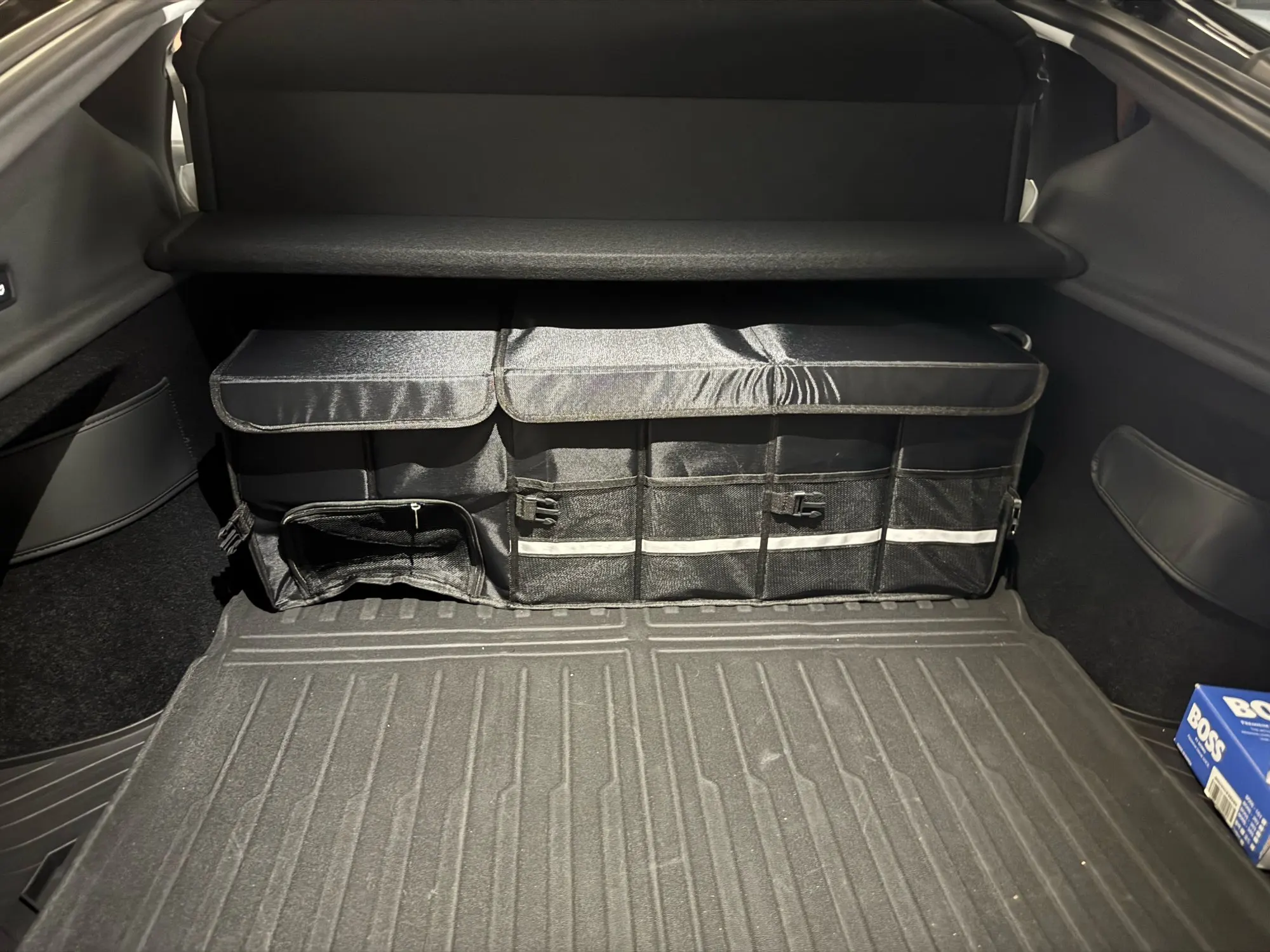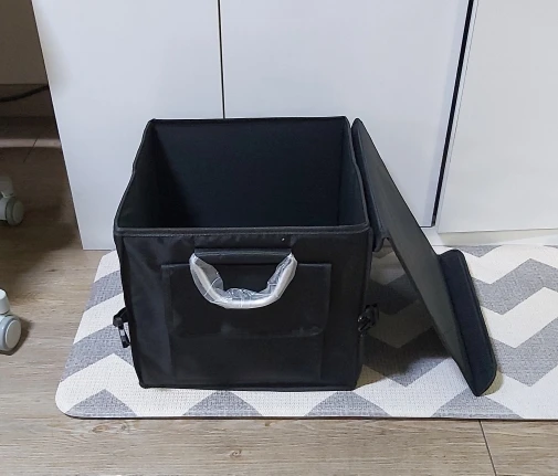 I bought the largest one, and it fits perfectly in the Model Y's trunk. First of all, the fabric seems sturdy and okay. It's okay because you can put miscellaneous items inside and cover them with the lid attached. The lid is in a Velcro style. The part where shoes go doesn't make sense, I don't know why it's there. It seems better without the shoe compartment... I think I got a good deal at a reasonable price.