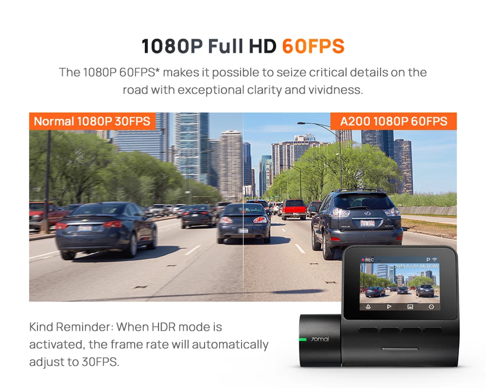 The 1080P 60FPS* makes it possible to seize critical details on the road with exceptional clarity and vividness.