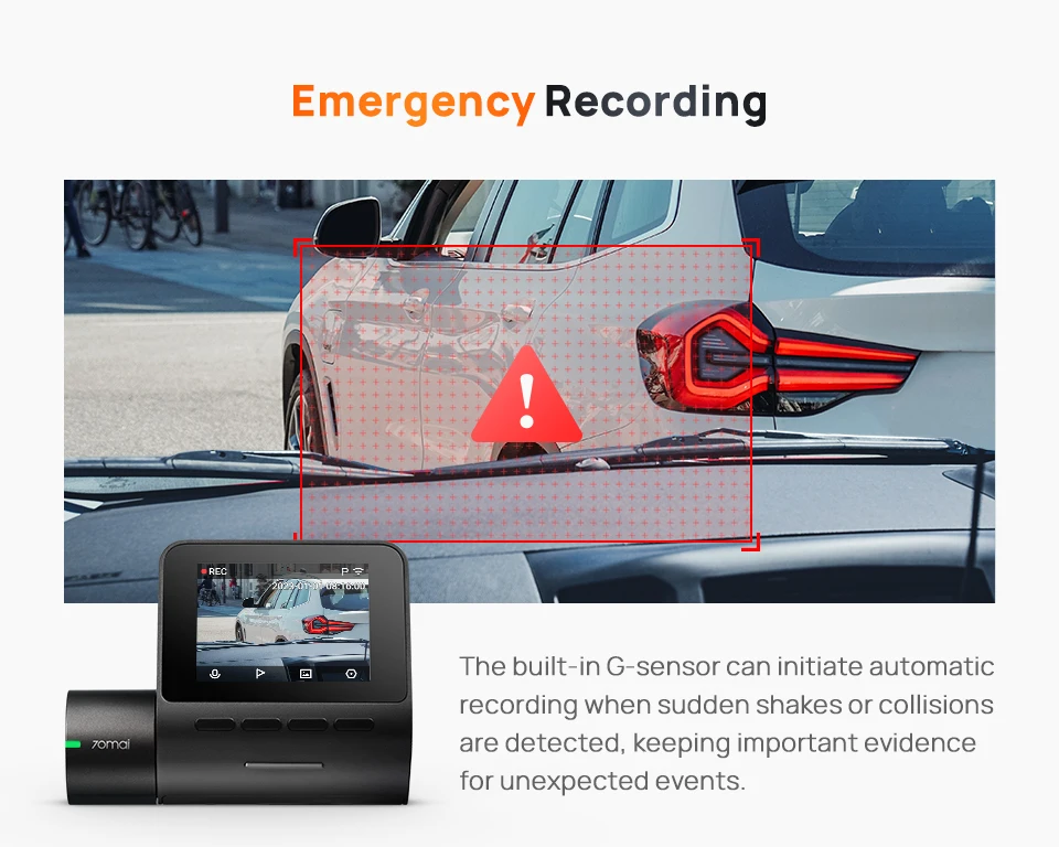 With G-Sensor, 70mai dash cam A200 automatically records the emergency situation and saves the videos for you.