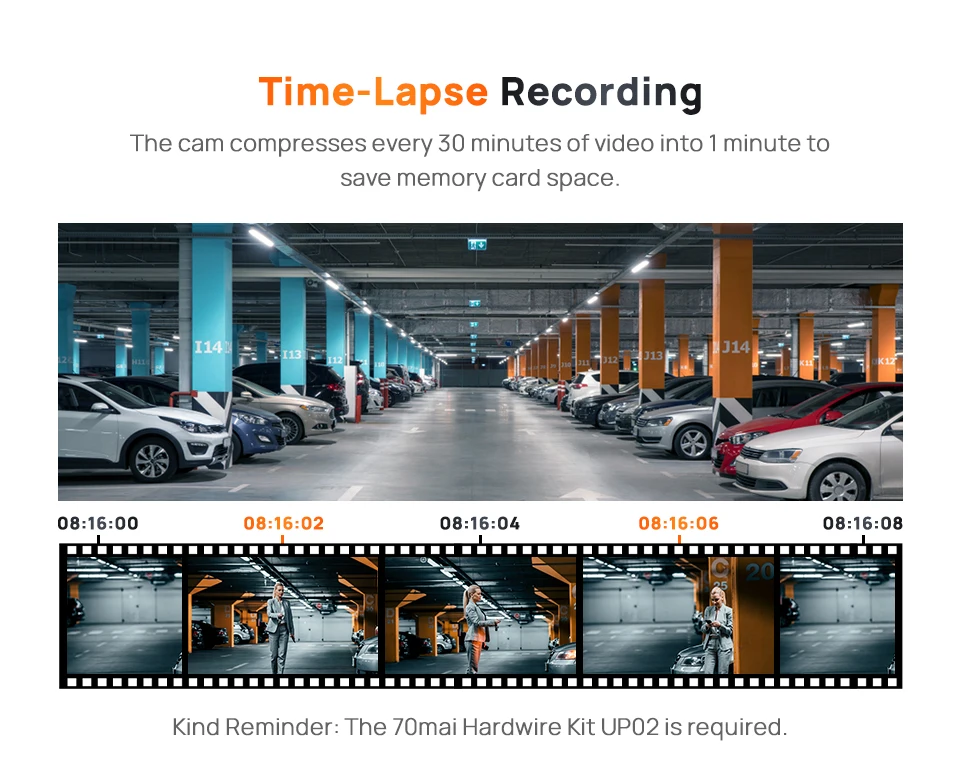 Time-Lapse Recording: The dash cam A200 captures continuous footage at 1FPS during parking mode, saving memory card space by compressing every 30 minutes of video into just 1 minute. Therefore you can expect a faster playback for quick event recognition.