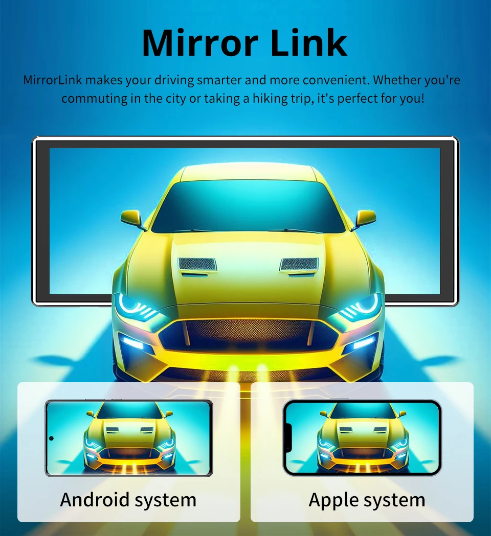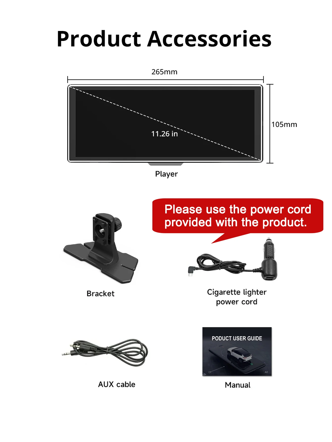 Function:Support IPS screenSupport FM signal transmission functionSupports USB flash drive SD card (audio/video/Image)Supports Bluetooth function (5.0 Bluetooth)Supports WIfi (2.4G+5G)Supports wired mobile projection screen, wired and wireless Android Auto/Apple CarPlaySupports reverse view function (optional AHD camera). When the car is in reverse gear, it will automatically switch to the reverse image.Supports wired and wireless CarPlay+Android Auto, enabling one click navigation, music, voice assistant and other functions on your phone, allowing you to easily enjoy driving pleasureSupports high-definition inverted images (requires camera selection).Working voltage: 12-30VWorking temperature: -10~70 ° CBluetooth version: 5.0 versionDisplay resolution: 19200x720Screen size: 11.26 inchesSingle weight: 0.91kgAudio format: MP3/AAC/APE/OGG/M4A/RA/WAVVideo format: H263/H264/H265/DIVX HD/AVI/FLV/MKWIMPEG/MP4/WMV9NC/ASF/TS/QTImage format: JPG/PNG/BMP/GIF/TIFFLanguage: English, Chinese, Traditional Chinese, Spanish, Portuguese, Russian, German, French, Turkish, Arabic, Hebrew, Italian, Czech, Japanese. Korean, Thai