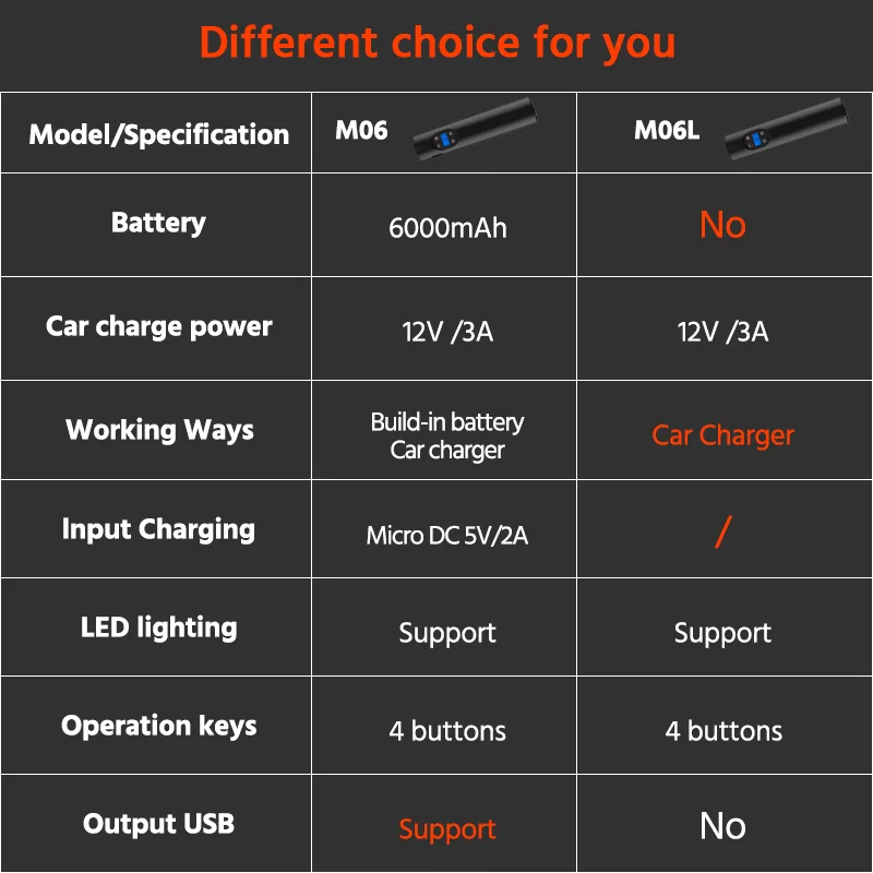 M06L: 4 Buttons without battery, use cigarette lighter to work.