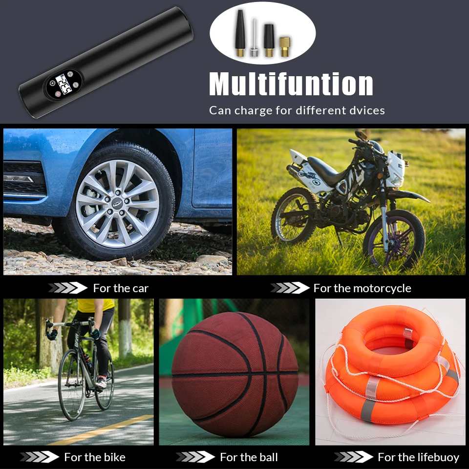 ●INFLATES ANYTHING: Includes 3 nozzle adapters and 1 air hose. Use the Schrader valve on cars, SUVs, motorcycles, and bicycles. Use the Presta valve for a bike tire pump. Needle adapter for sports equipment like basketballs. General adapter for cushions, air pillows and similar.