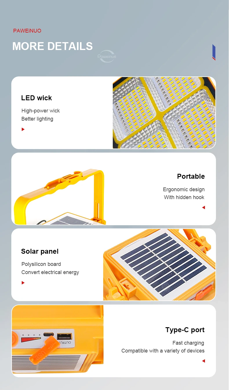 This newly upgraded solar rechargeable portable camping lamp uses 300 LED wicks, which is 10 times brighter than ordinary solar energy and has a lighting range of up to 300 square meters. Something to rely on at night. Made of super ABS material, the anti-drop range is 1.5 meters. Heat and cold resistant, you can carry it with confidence. Built-in 20000mAh battery, can be used for 7-16 hours+, and can also be used as a mobile power source for emergency use. Using the latest Tpye-c fast charging, it can also be charged through solar energy, which perfectly solves the problem of zero-power charging. It is environmentally friendly and saves electricity bills. The best tool for your night lighting expert! Paired with a beautiful gift box, it can be given as a gift to your favorite person!