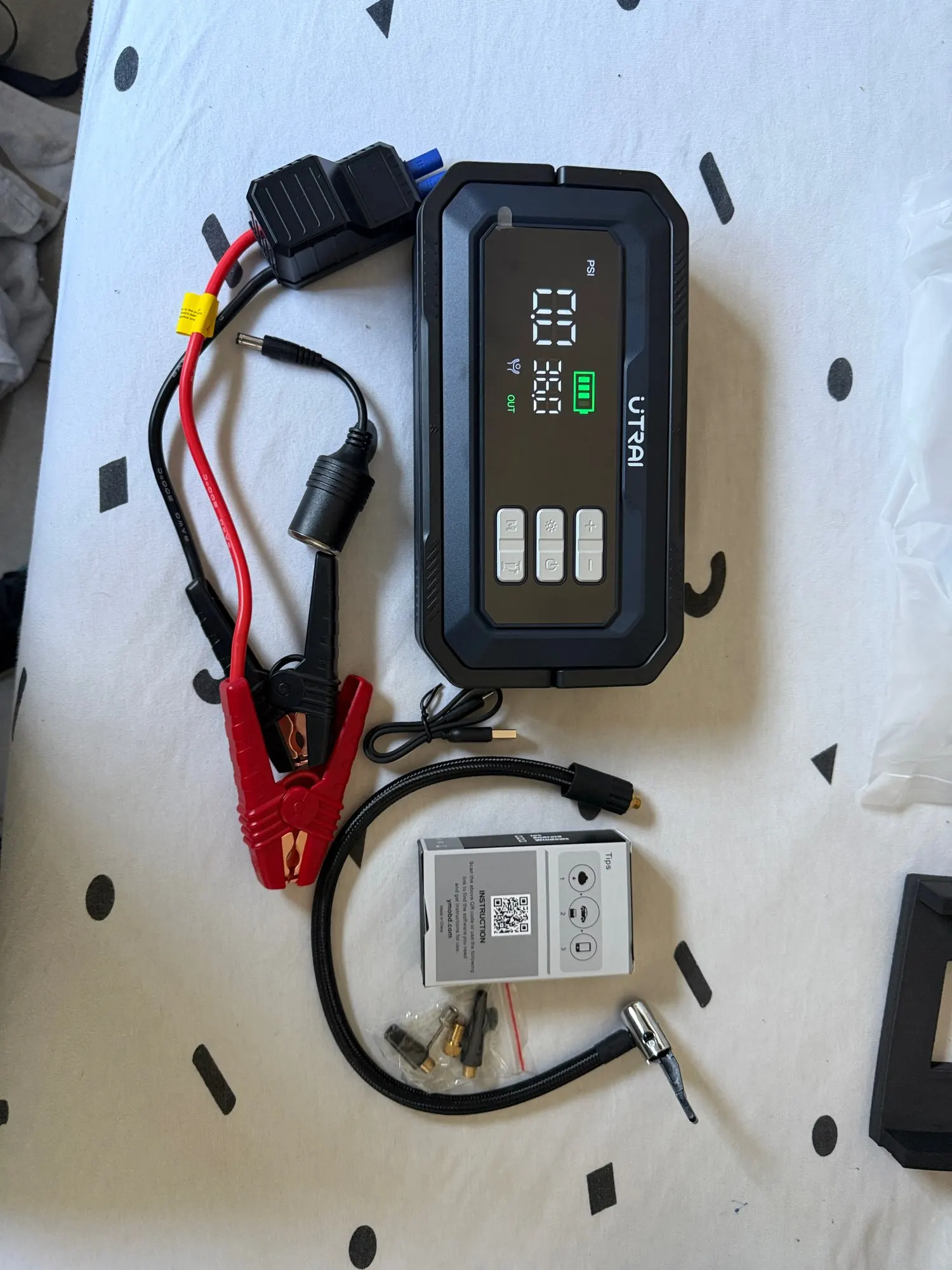 Hello, great product. New Utrai: the Utrai JS-30 starter kit, completely new and highly effective. With its 16,000 mAh battery and high amperage, it can start very powerful diesel or gasoline vehicles. It is also equipped with a compressor with a power of 150 psi and a very bright and foldable LED lighting. The kit also includes an OBD diagnostic tool to view vehicle errors and other useful accessories. It can be used as an external battery or as a power station via a USB port or a 12 V cigarette lighter adapter. Everything works very well, fast delivery, and thank you very much for the product. 👍