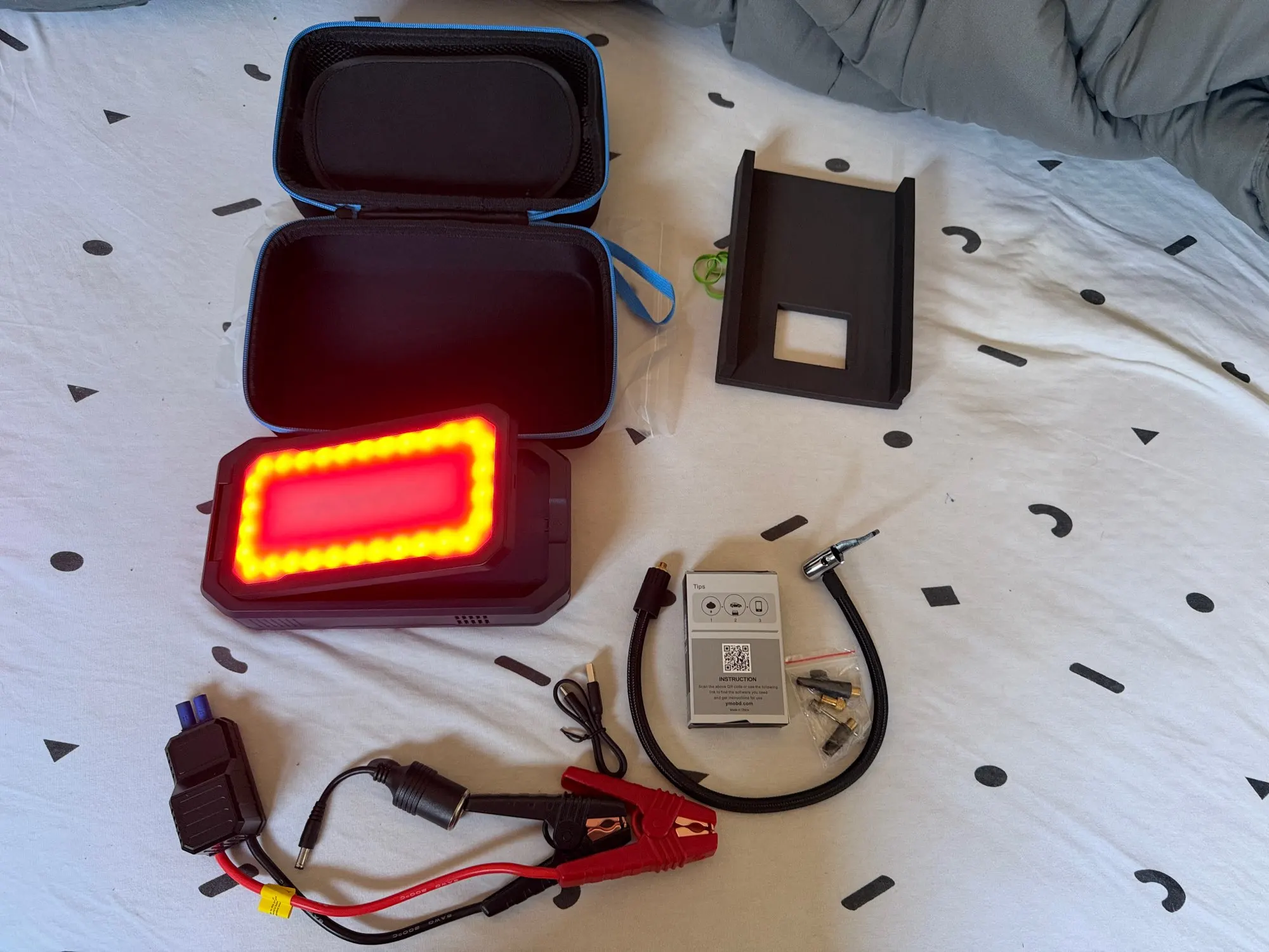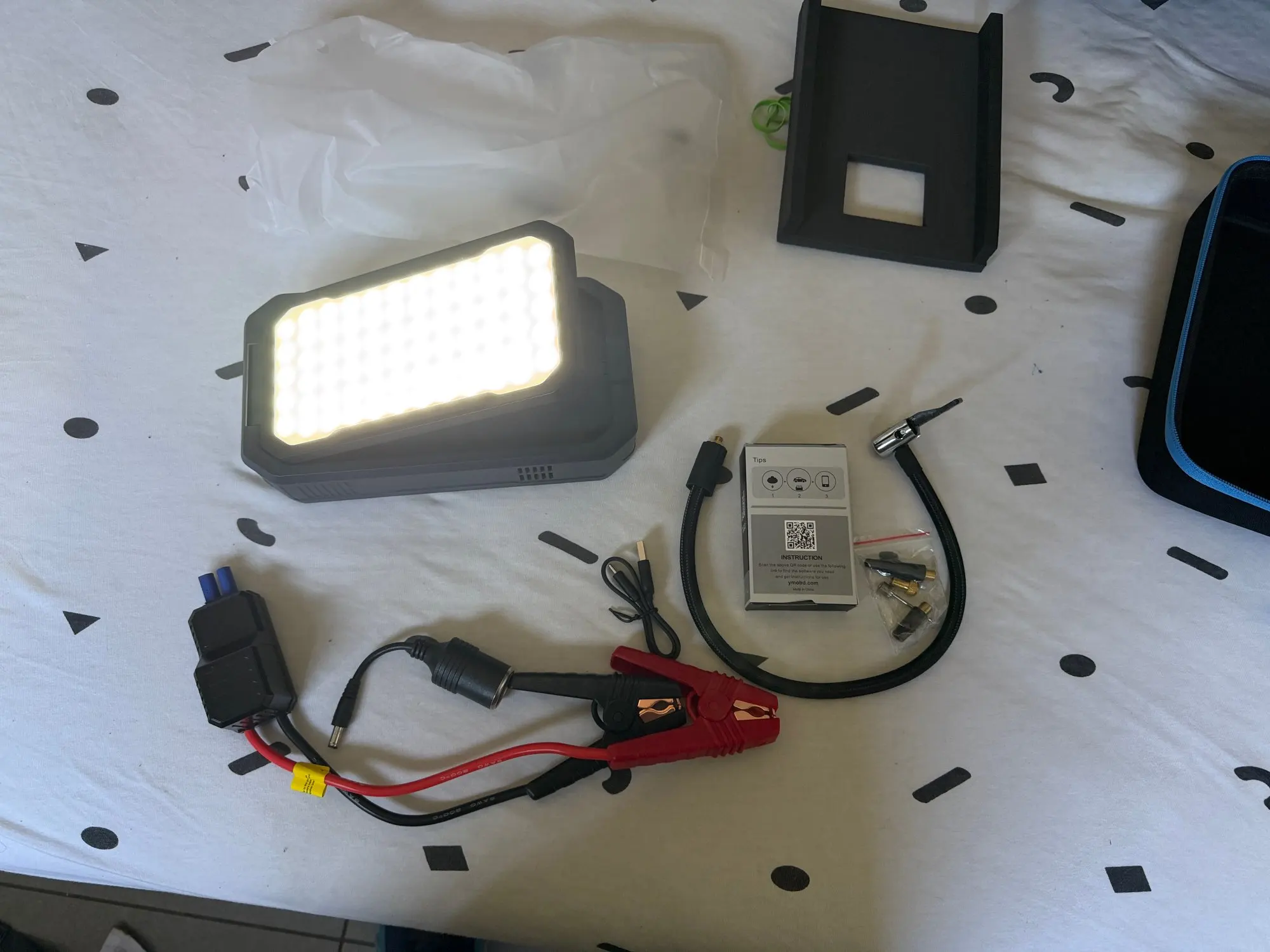 It seems bombastic that this is exactly what I expect from a product with such features. It comes with a storage bag and a bunch of accessories, which is even better. The flashlight has various operating options as well as grip handles and a digital display with multiple indicators. In my case, it came with an adapter for the vehicle's diagnostic socket and an operation manual, probably part of the product package. Regarding the battery life, I rely on another model from the company with which I have experience and believe and hope that there is no difference between the two in this matter. One strange and frustrating thing in my case is that the package arrived at the other end of the city to a place that has no opening hours and no phone response, which made me have to come twice to collect the package.