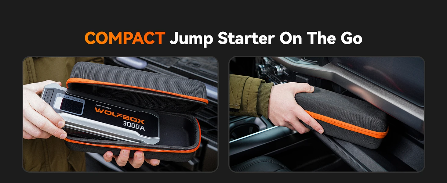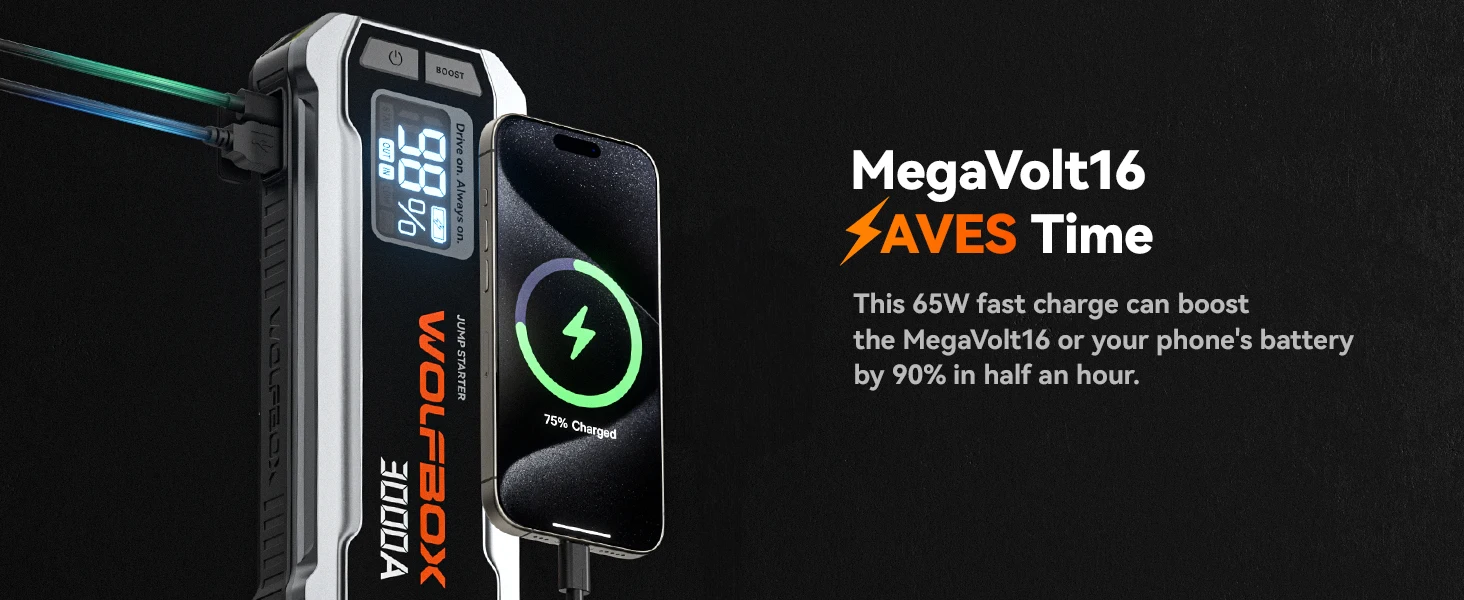 WOLFBOX 3000A Jump Starter,12V Car Battery Jump Starter,65W Quick Charge 16000mAh for 8L Gas 6L Diesel Engine with Booster